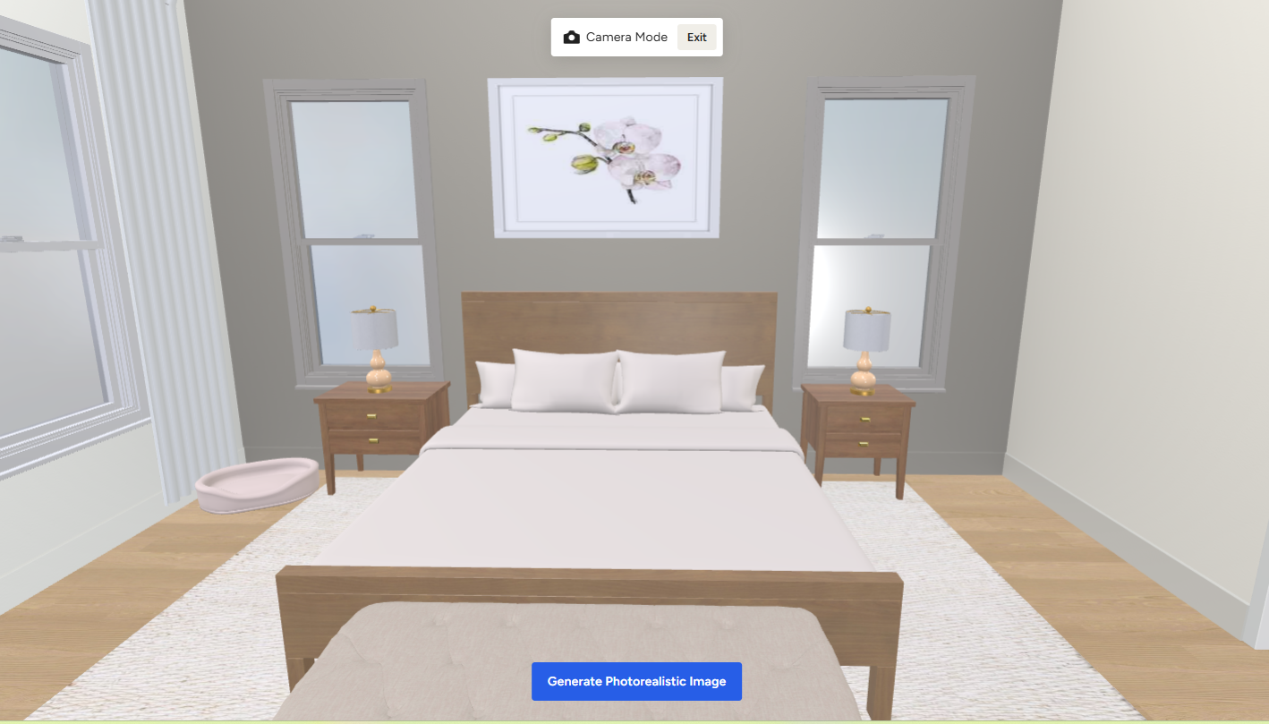 we want natural rattan or fluted wood side tables an upolstered bedframe that is tall a unique bench in fornt and some cute art on the wall architecture