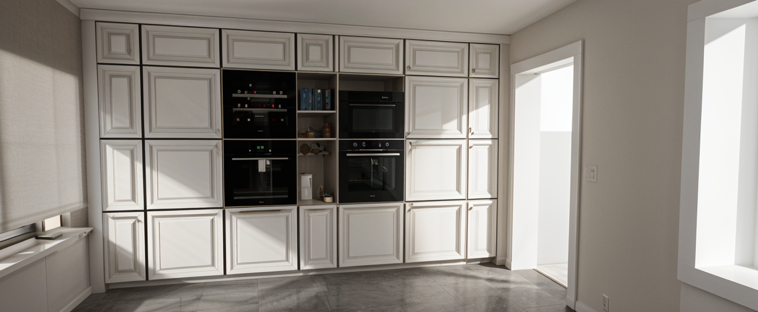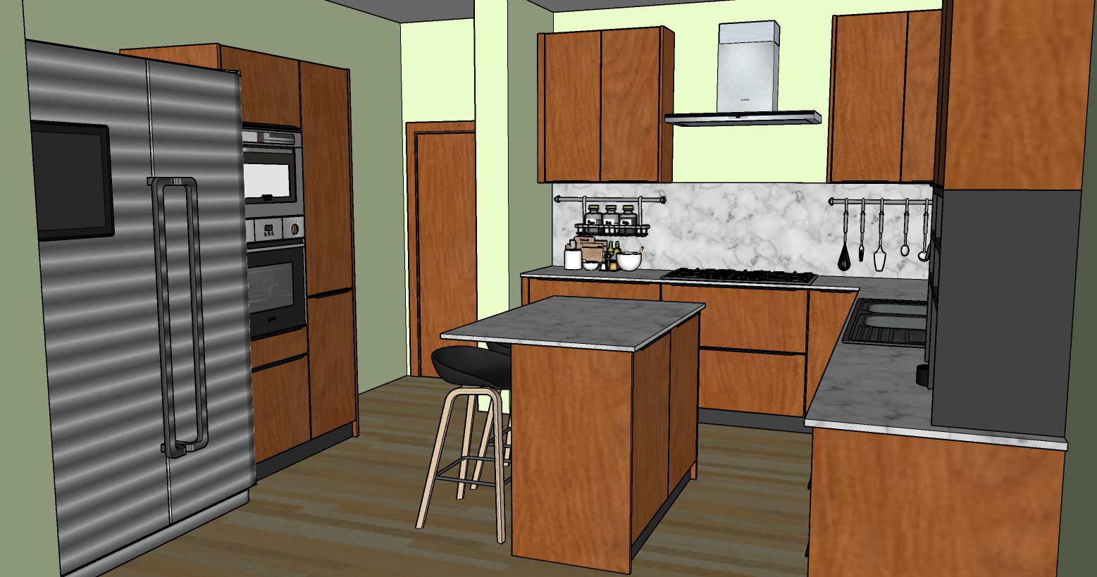 warm wood kitchen with oak floor and light olive green walls a white marble counter top and stainless steel appliances