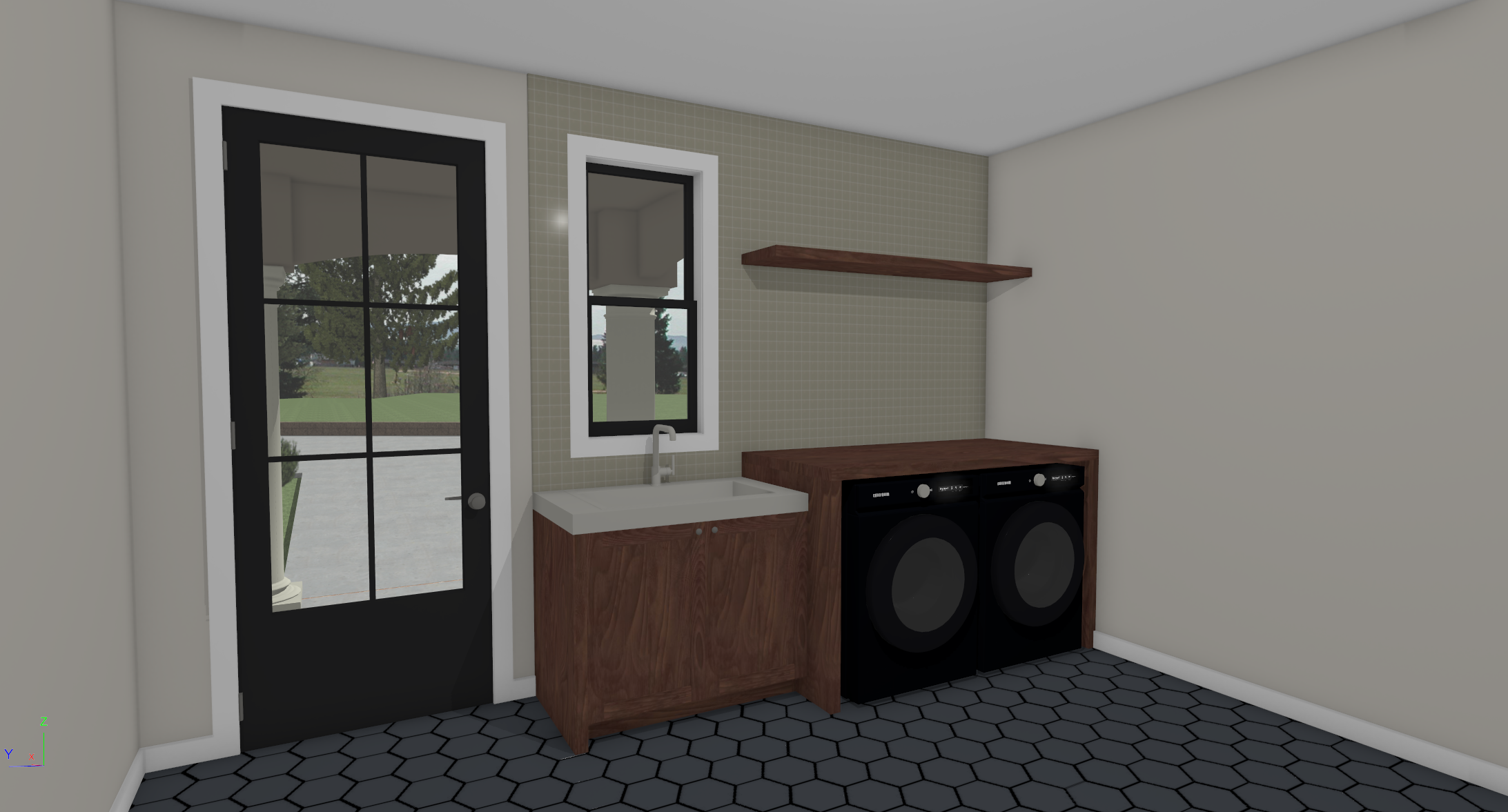 show this home as a photorealistic rendering keep exact architectural details add a rug on the floor decor on the shelf