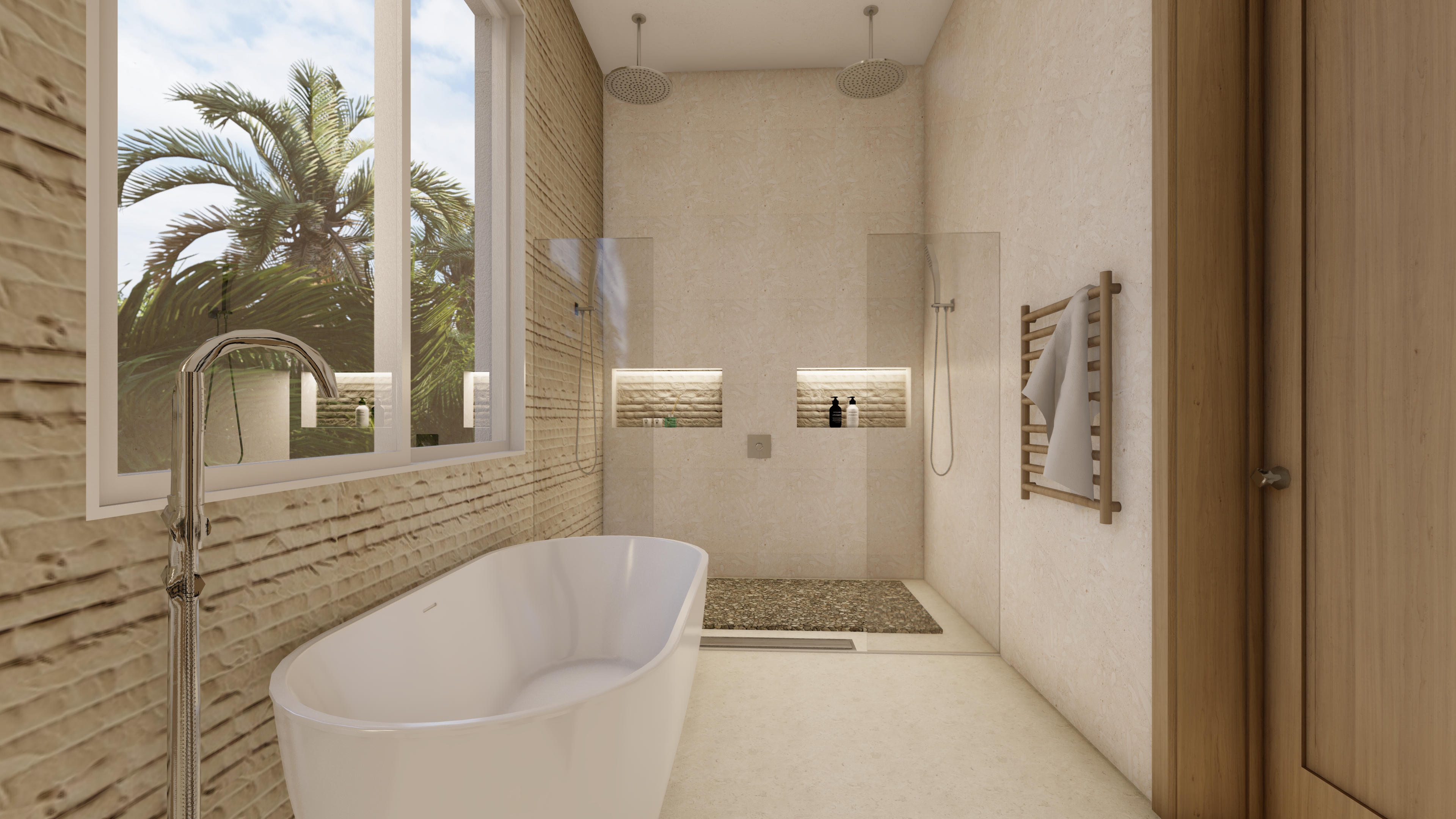 acabado foto realista con marco de ventana color negro y puerta color blanco el piso de la ducha es tipo piedras blancas peque as