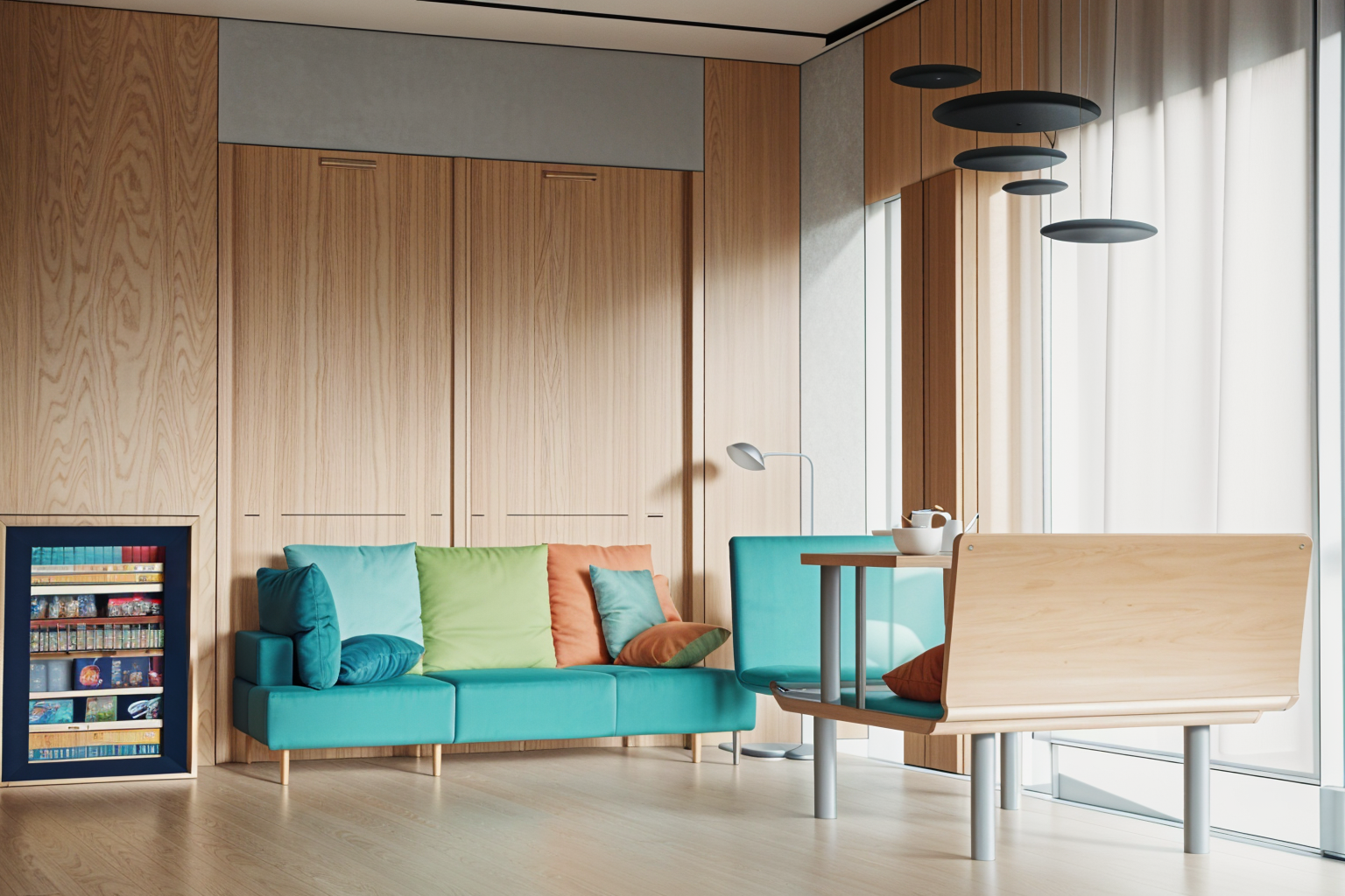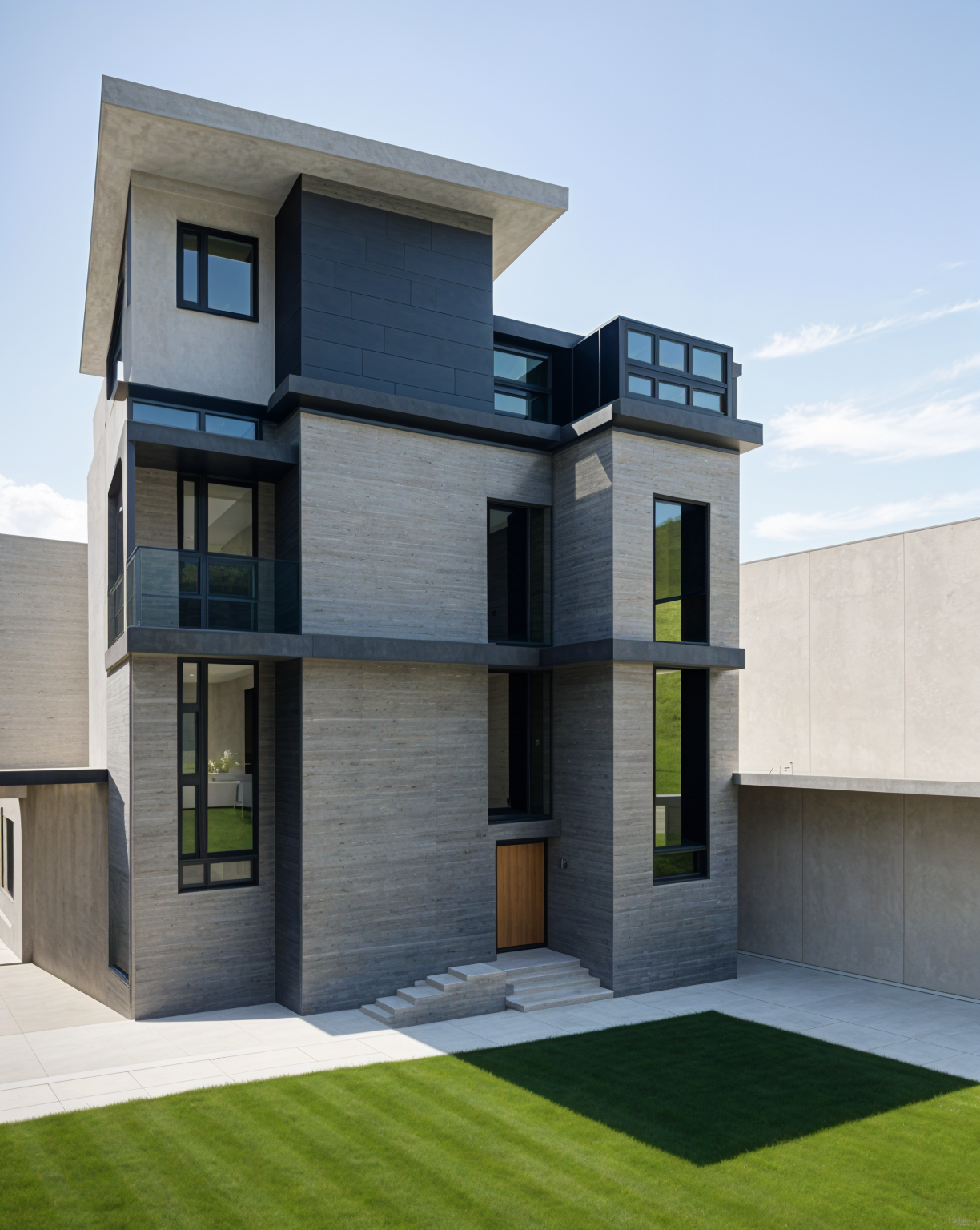 contemporary exterior shot modernist exterior shot visualize a modern residential building with a contemporary design the building should have wooden exterior walls large windows with reflective glass and sleek black accents along the edges the atmosphere should be light and airy with clear blue skies and soft sunlight casting soft shadows the surrounding landscape should include lush green grass colorful flowering shrubs and tall deciduous trees with autumn colored leaves architecture with glass parapet architecture