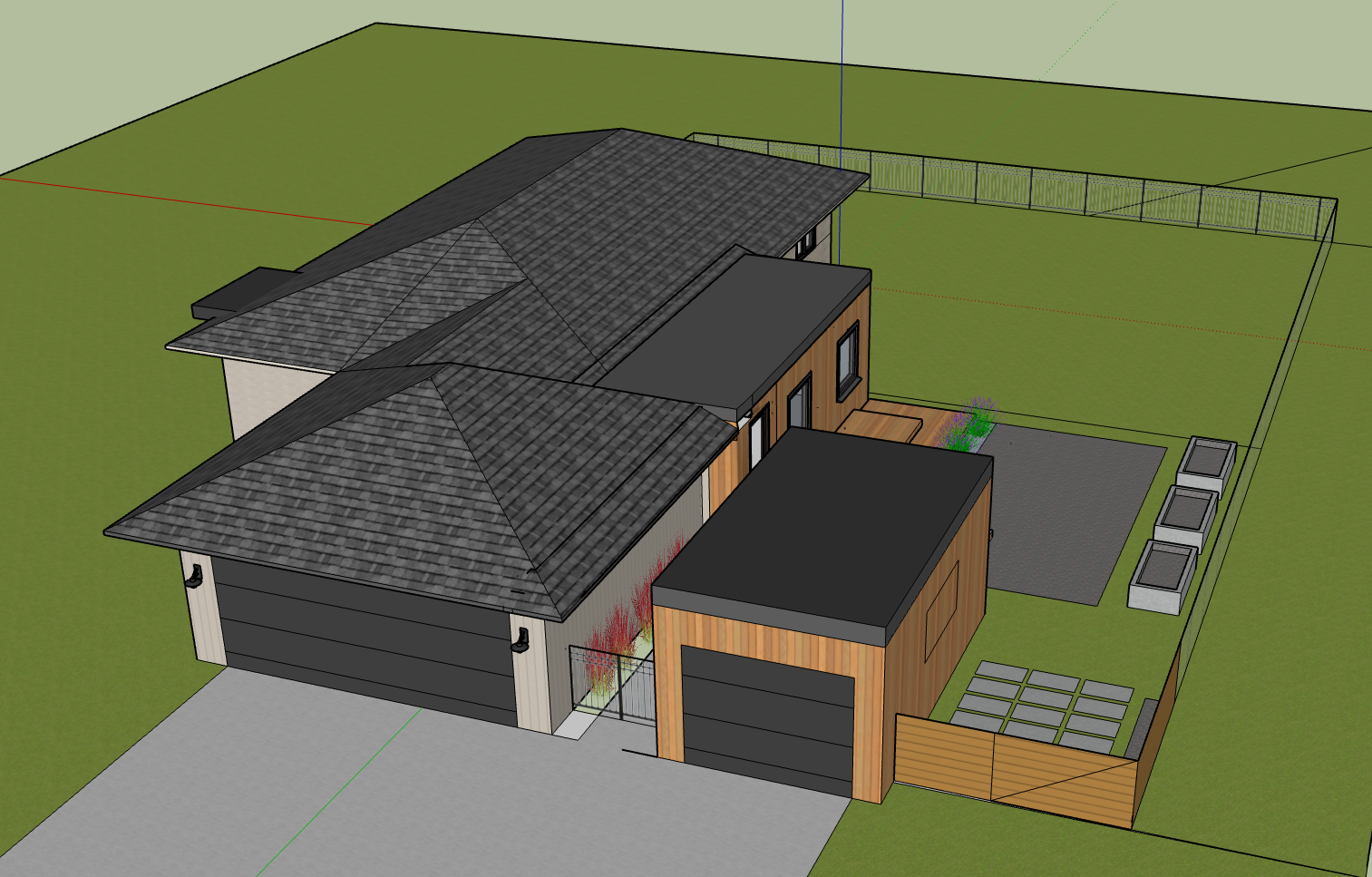 render this concept as a minimalist dutch design concept keep the wood cladding as it is on both the rear portion of the home and the detached garage