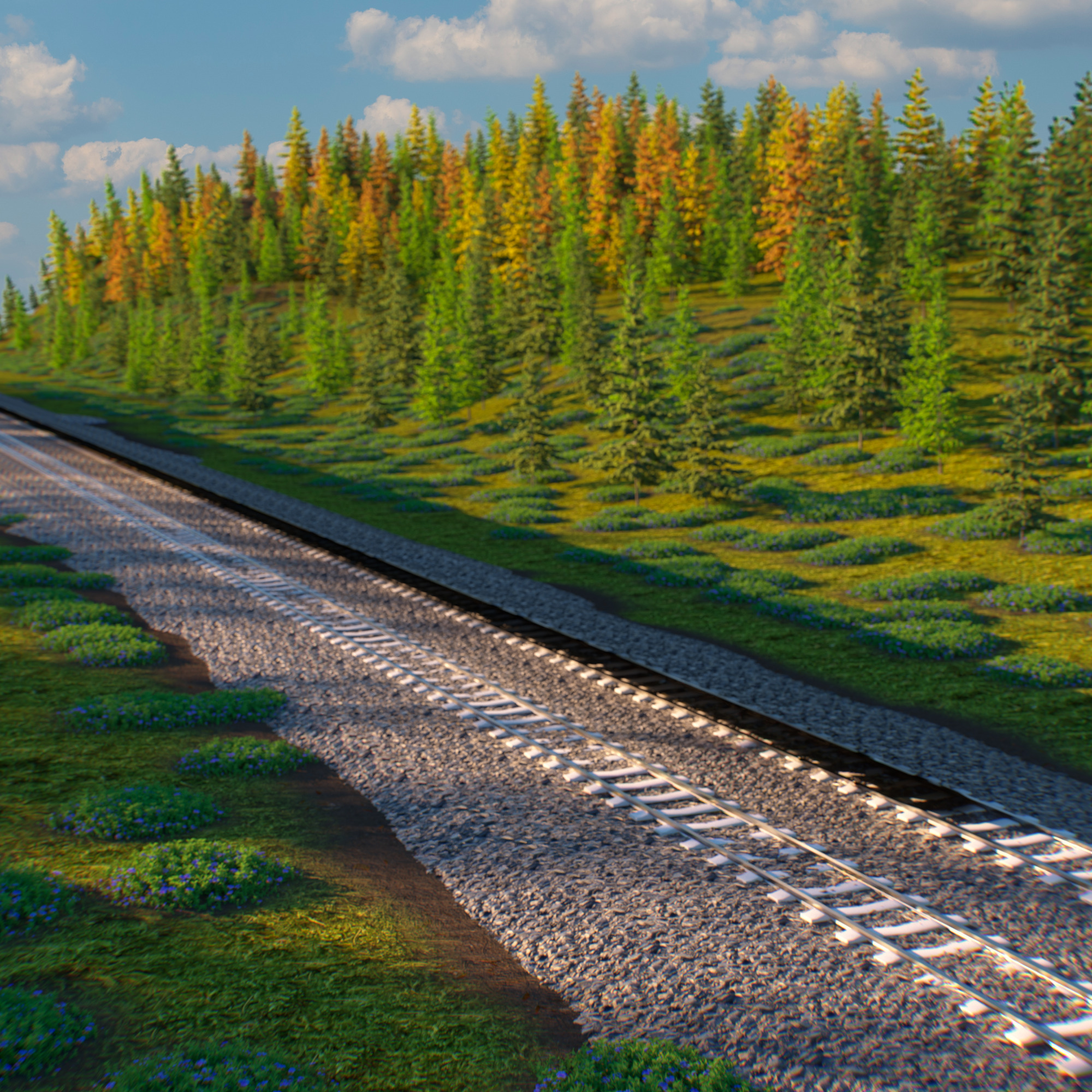enhance material realism only keep the exact reference image composition geometry camera and layout unchanged increase the texture detail of the small gray ballast rocks and refine the concrete railway surface with subtle roughness and natural micro imperfections preserve all shapes and positions exactly