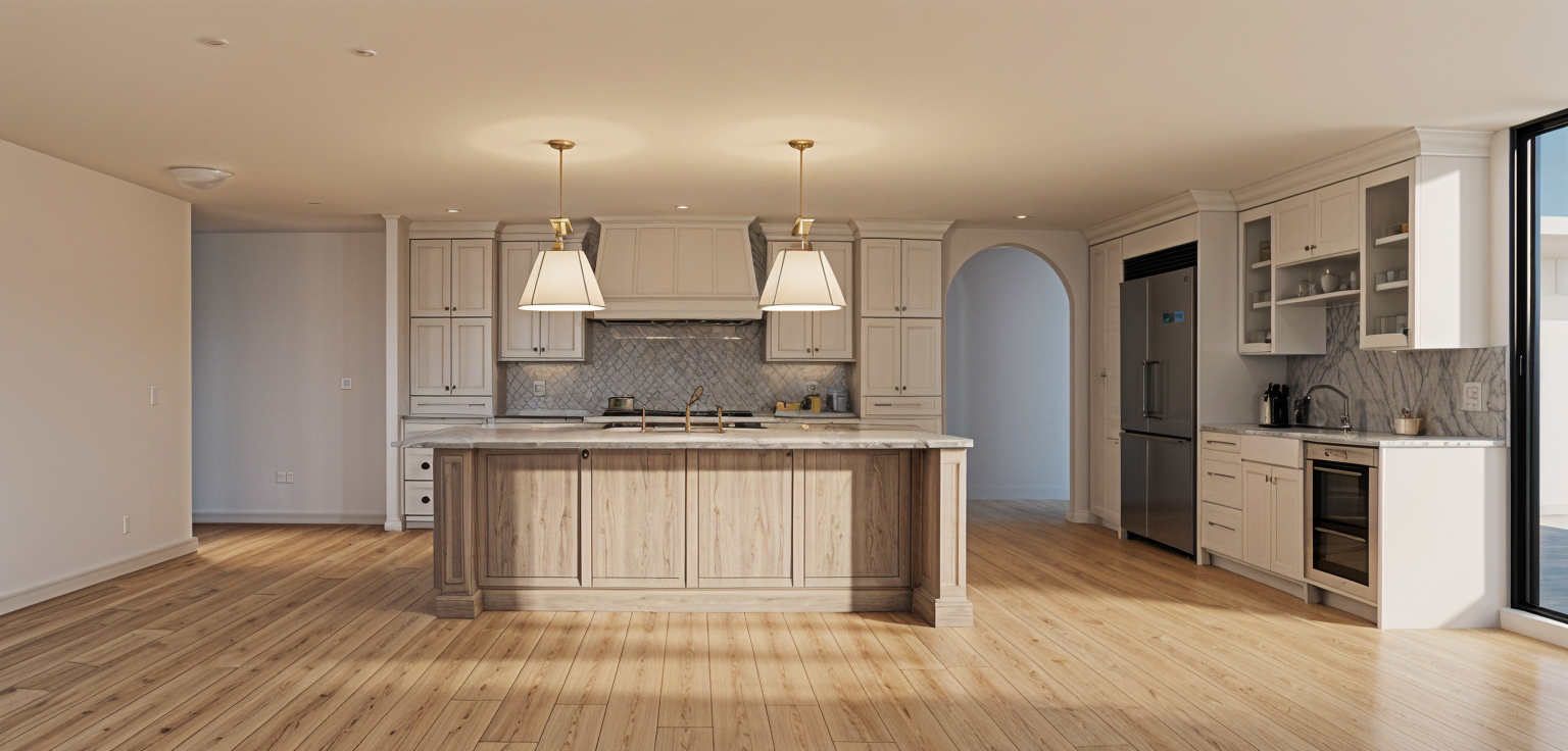 make a 3d elevation of home on a wooded lot that slopes down to the rear and has landscaping that doesn t get in the way of the driveway shingles are black garage door is black gutters are black windows with grids are black siding is functional gray color trim is snowbound color brick is coral blend color by brickcraft chimney is horizontal siding