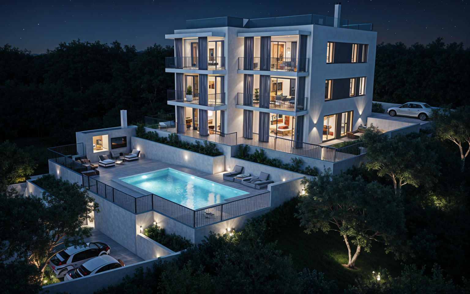 zaha hadid exterior shot medireranean forest background olive trees in garden glamour interiors in windows grey vertical stripes full floor height random railings ethimo furniture grey window frames white facade white marble pavement shining blue mosaic pool in front of balconies random floor to floor vertical striped panels 80 by 320 cm architecture