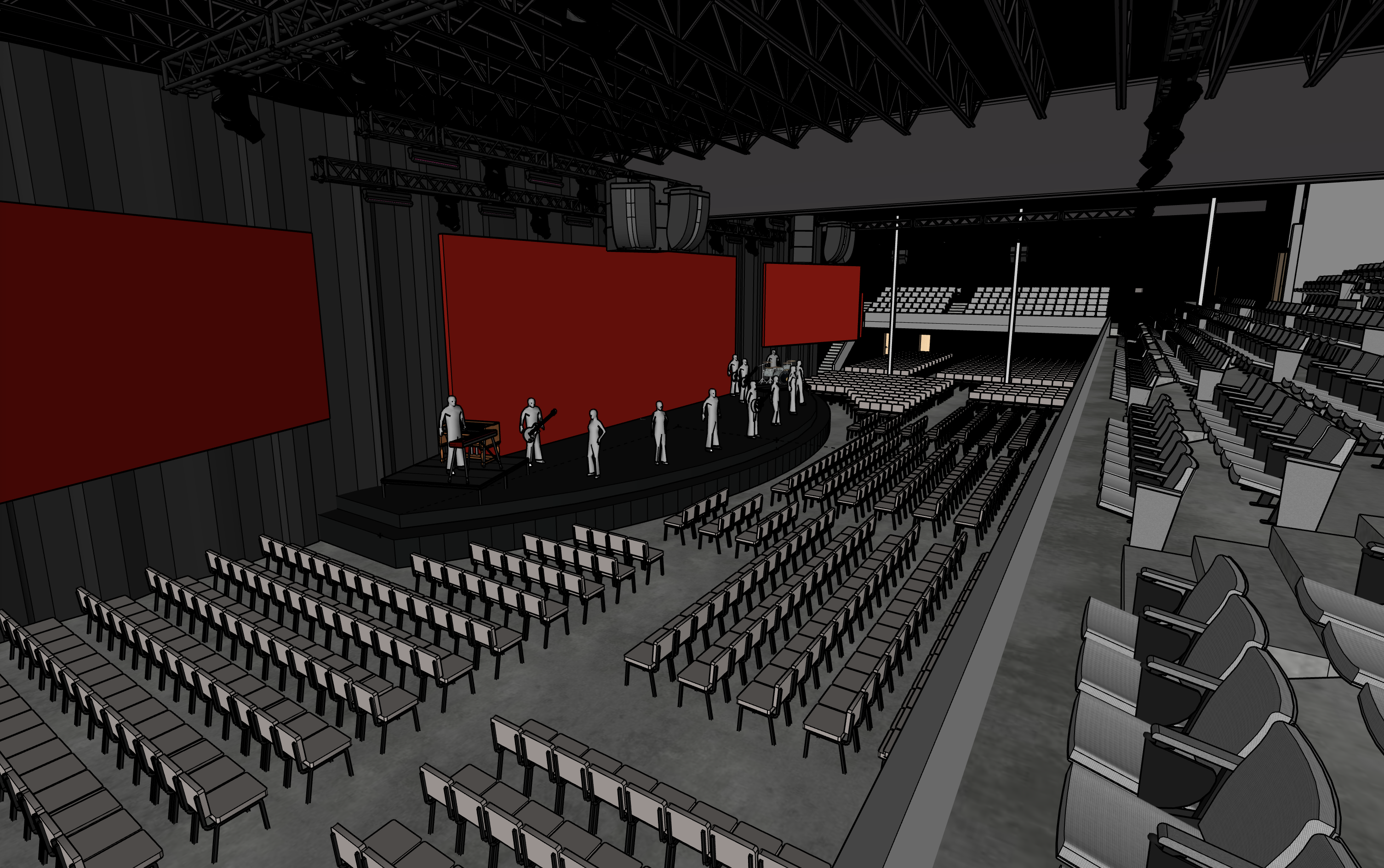 high tech interior shot this is a rock and roll mega church the red boxes are led screens and should all have a matching image on them that is abstract and natural filling the entire red boxes lighting from overhead should be 3000 degrees k and pendant can style spaced every 15 ft with an overall foot candle measurement at the seating of 25fc the room color scheme should be various shades of gray the stage is the black surface under the center red box it should be matte black in a marley style finish front light is shown lighting fixtures that are suspended from stage trusses around the perimeter of the stage these should be aimed at the stage to generate a full stage wash of light at 4500 degrees k the lighting fixtures over the stage should be outputting a color wash on the stage to match the image on the red led screens there should be fine particle haze in the room as would be output from a mdg atme hazer with co2 tank architecture