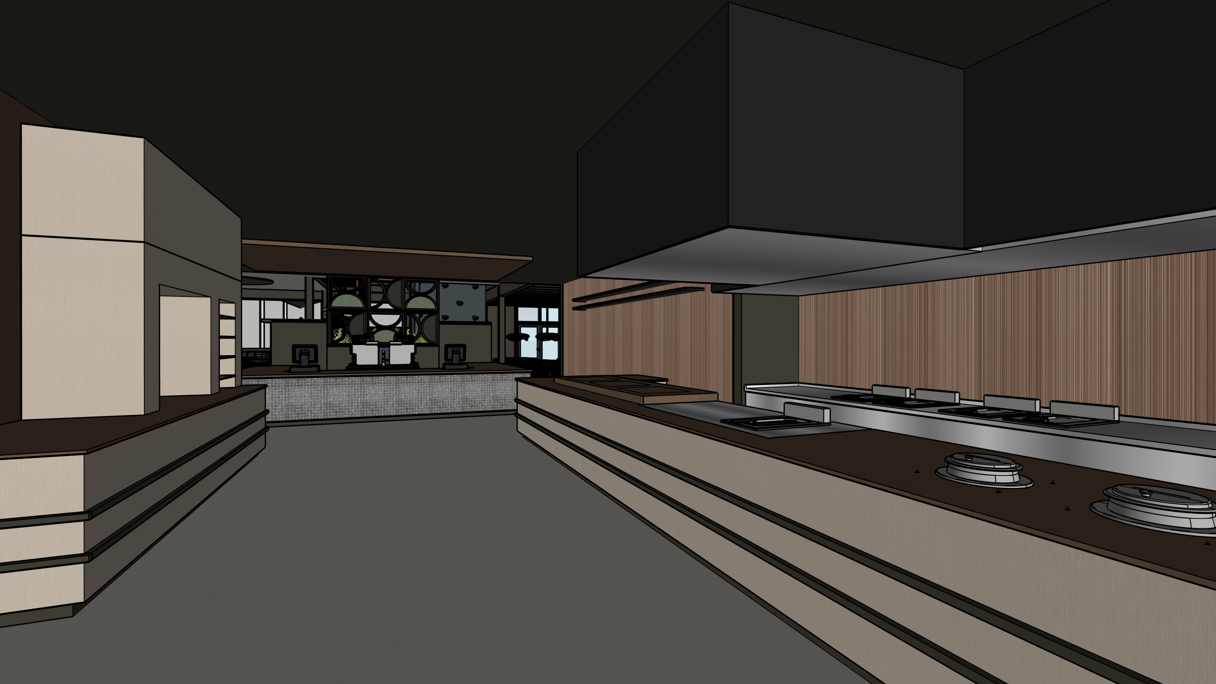 a photorealistic 8k high resolution interior photograph captured in natural bright daylight based strictly on the current perspective and composition the perspective looks through the kitchen service area towards a background bar and dining area maintaining a clean crisp daylight atmosphere natural daylight floods in from the left and distance avoiding heavy shadows there are no changes allowed to the design proportions or placement of the original wireframe structure structure walls the main walls and the ceiling structure are finished in a smooth matte coat of little greene attic 2 dark charcoal green appearing distinctly brightened by daylight furniture textiles straight benches foreground the visible edge of the straight benches is upholstered in a refined light grey vintage leder with a clean finish dux vintage fr light grey dining chairs the few visible chairs like the one in the background feature walnoot hout frames and bases upholstered in a coarse tactile grey beige woven fabric fabb bjornn 77 pillow a black pillow remains on the bench built in elements materials planter boxes the visible edge of the integrated planter box directly behind the bench is covered in a textile look wood laminate decolegno alpaca fd32 in a clear camel beige tone filled with feathery grasses curved divider right the prominent curved room divider wall on the right partially visible is constructed of black wood with an intricate geometric pattern filled with rich green felt lighting the pendant light locations are rendered as realistic large dark rattan pendant lamps with a natural colored weave consistent with previous views ceiling details the exposed beams and the rest of the ceiling are finished in little greene attic 2 the linear bronze slat details over the distant bar and the large suspended felt ceiling discs in little greene attic 2 are visible in the background kitchen area the kitchen service counter area partially visible features fronts in a linear textured pale wood grain laminate decolegno reflex fd06 with precise dark charcoal green painted edges little greene attic 2 the continuous countertop is smooth polished dark brown natural stone with rich veining and texture background feature moza ek bar the curved bar visible in the background behind the patterned screens has its circular base cladding covered entirely in a fine textured glass moza ek in a range of cool greys with white and dark speckles ezarri terrazzo grey 50 refinement focus on accurate daylight interaction sharp texture definition for all materials leder felt rattan moza ek stone veining wood grain concrete accurate light behavior and realistic reflections natural daylight from the left distance must be dominant strict directive render the scene exactly as shown in the wireframe of the visual preserving all proportions and design elements but with a bright daytime atmosphere and photorealistic materiality and lighting omit all plants except the grasses