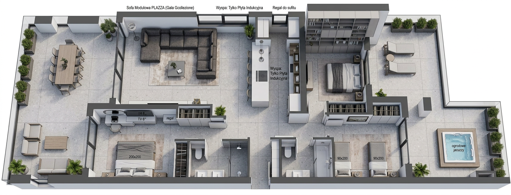 convert this floor plan into a realistic isometric 3d view of a full house show the space from an elevated angle with furniture walls and details visible na p od odze du e jasnoszare p ytki w salonie naroznik modu owy plazza firmy gala gcollezione w salonie nie ma foteli a na wyspie jest tylko p yta indukcyjna w du ej sypialni po prawej stronie rega do sufitu na tarasach p ytki okna s antracytowe kolorystyka wn trza jasna sofa jasnoszara w sypialni po lewej rega use the same furniture as shows on the plan do not change the orientation of the floorplan