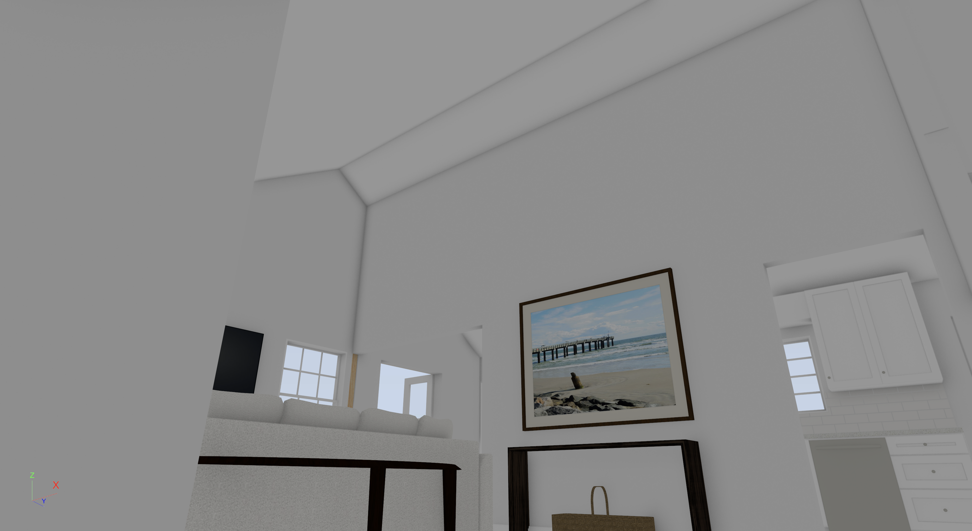 render a modern living room with a high ceiling featuring soft ambient lighting the walls should be a soothing light gray accented by a white ceiling the large couch is upholstered in a cream fabric paired with dark mahogany wooden elements sunlight streams through the windows casting gentle shadows a beach painting with a golden frame hangs on the wall filled with vibrant blues and sandy tones the atmosphere is modern yet cozy embodying tranquility and elegance
