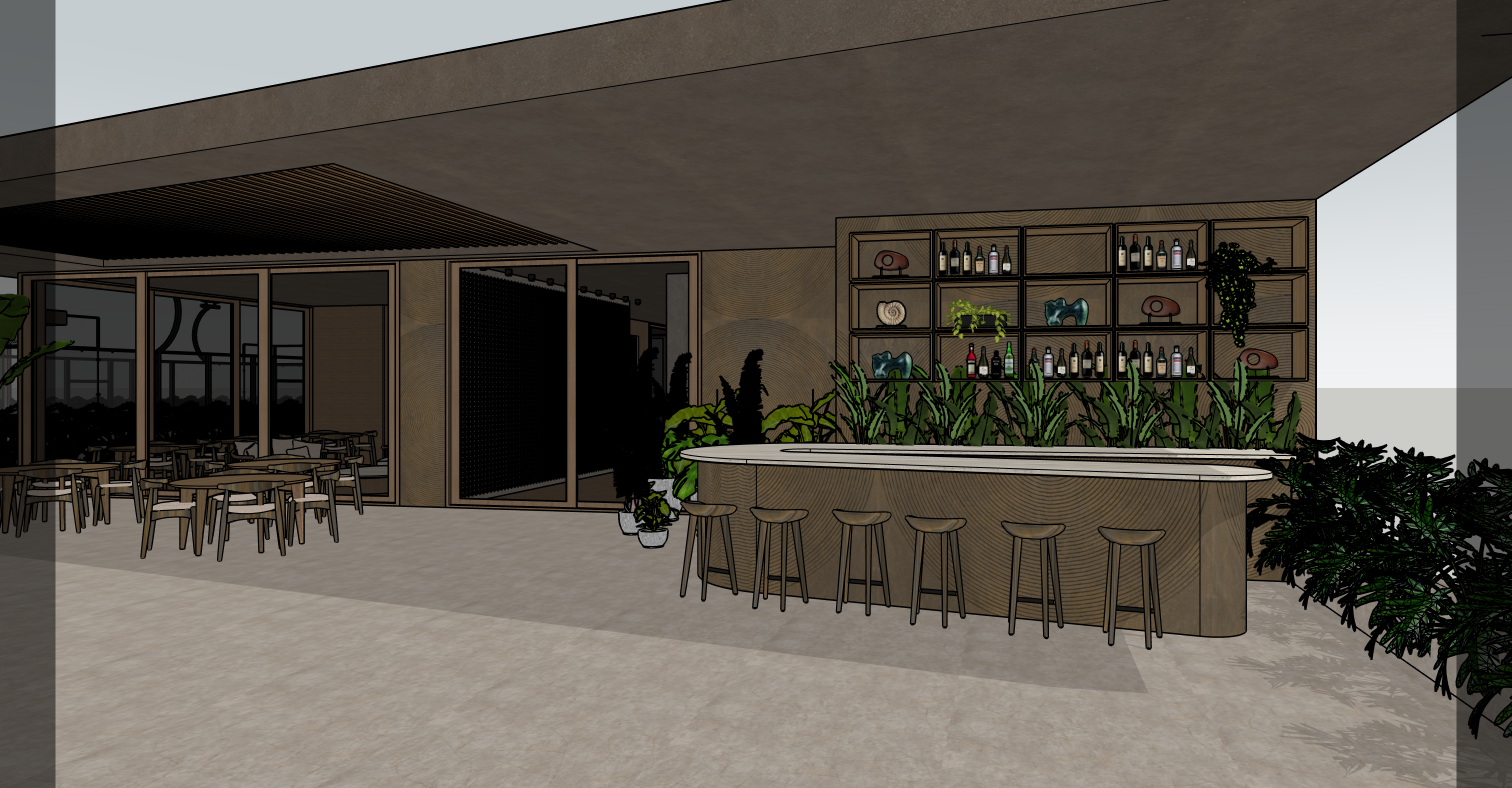 render a luxurious modern indoor bar area with a natural and cozy atmosphere use warm rich mahogany for the ceiling and elegant beige for the walls and bar structure the bar top should be a sleek polished black incorporate lush green tropical plants for a lively touch include stylish wooden bar stools with a light oak finish the floor should be a dark slate gray providing a sophisticated contrast the shelves should display various colorful bottles adding vibrancy to the space the lighting should be soft warm and inviting creating a welcoming ambiance