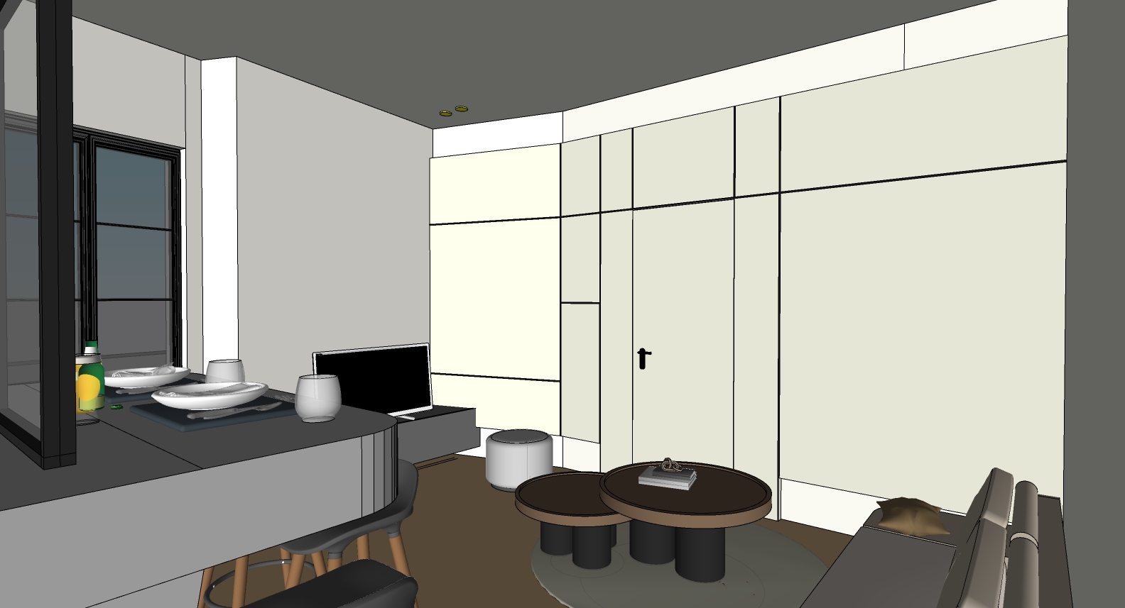 modern and minimalist living area with elegant furnishings flush fitting door white walls and herringbone parquet flooring flat white false ceiling with spotlights soft ambient and artificial lighting that creates a relaxing atmosphere