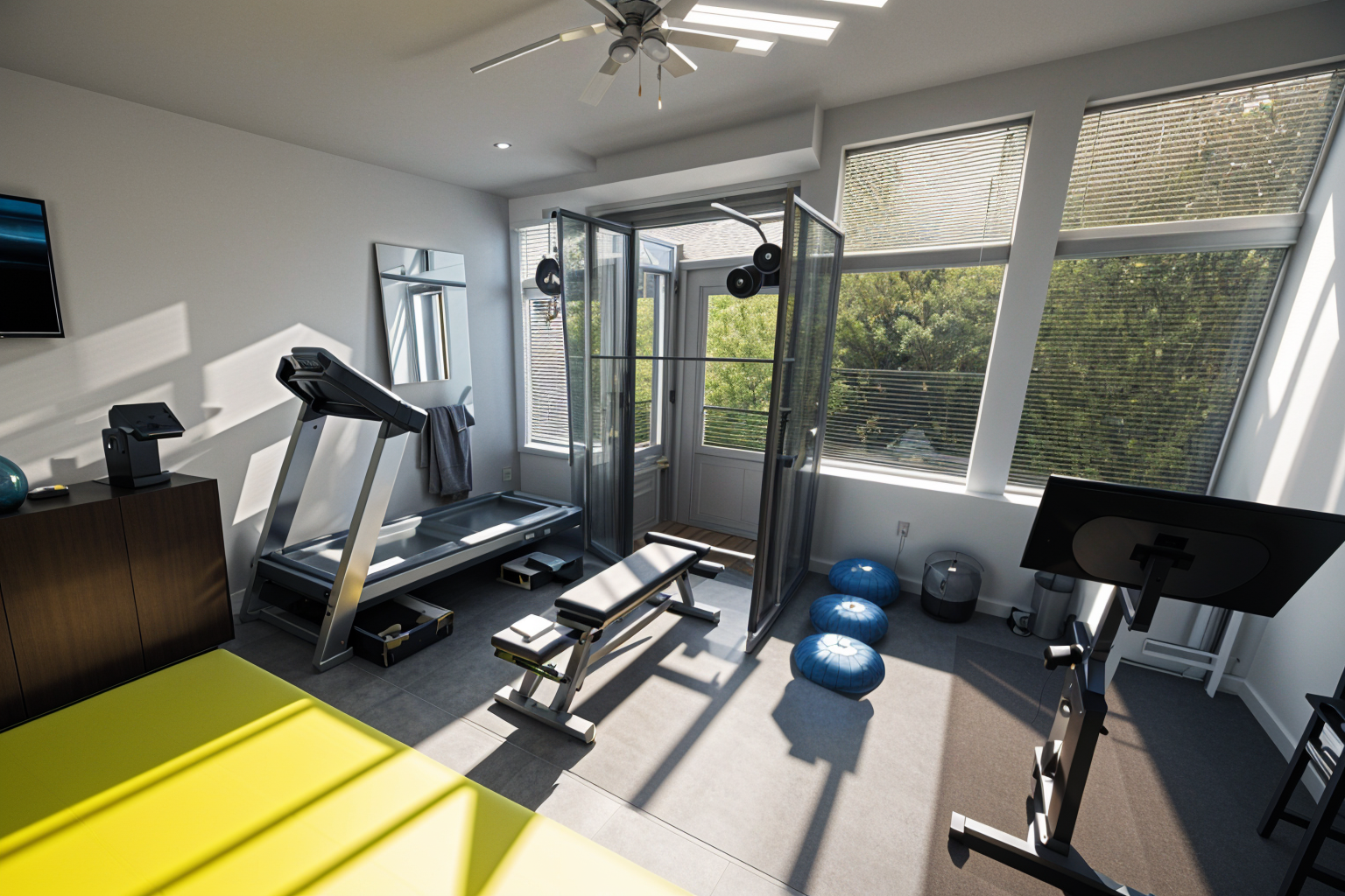 high tech interior shot modern home gym in a detached garage in vancouver rubber flooring squat rack dumbbell set peloton bike wall mounted mirror motivational posters clean and organized daylight streaming in through windows architecture