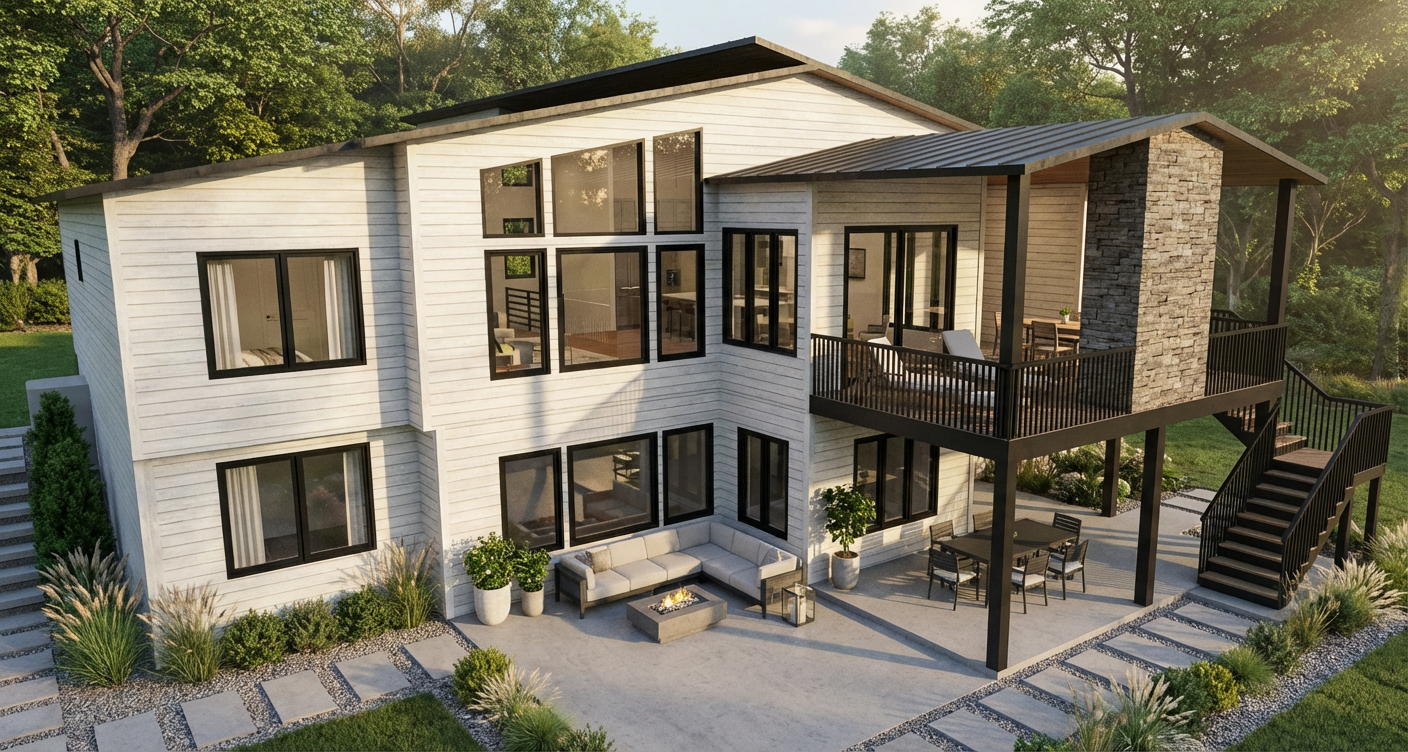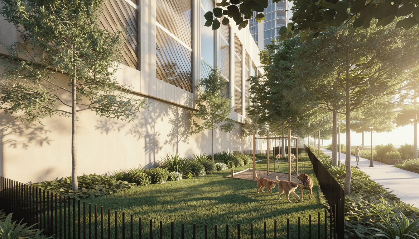 marketing image for luxury building dramatic day time lighting simple planting in the areas shown as groundcover add simple dog park elements like small climbing ramps and boulders high end finishes do not alter the building facade