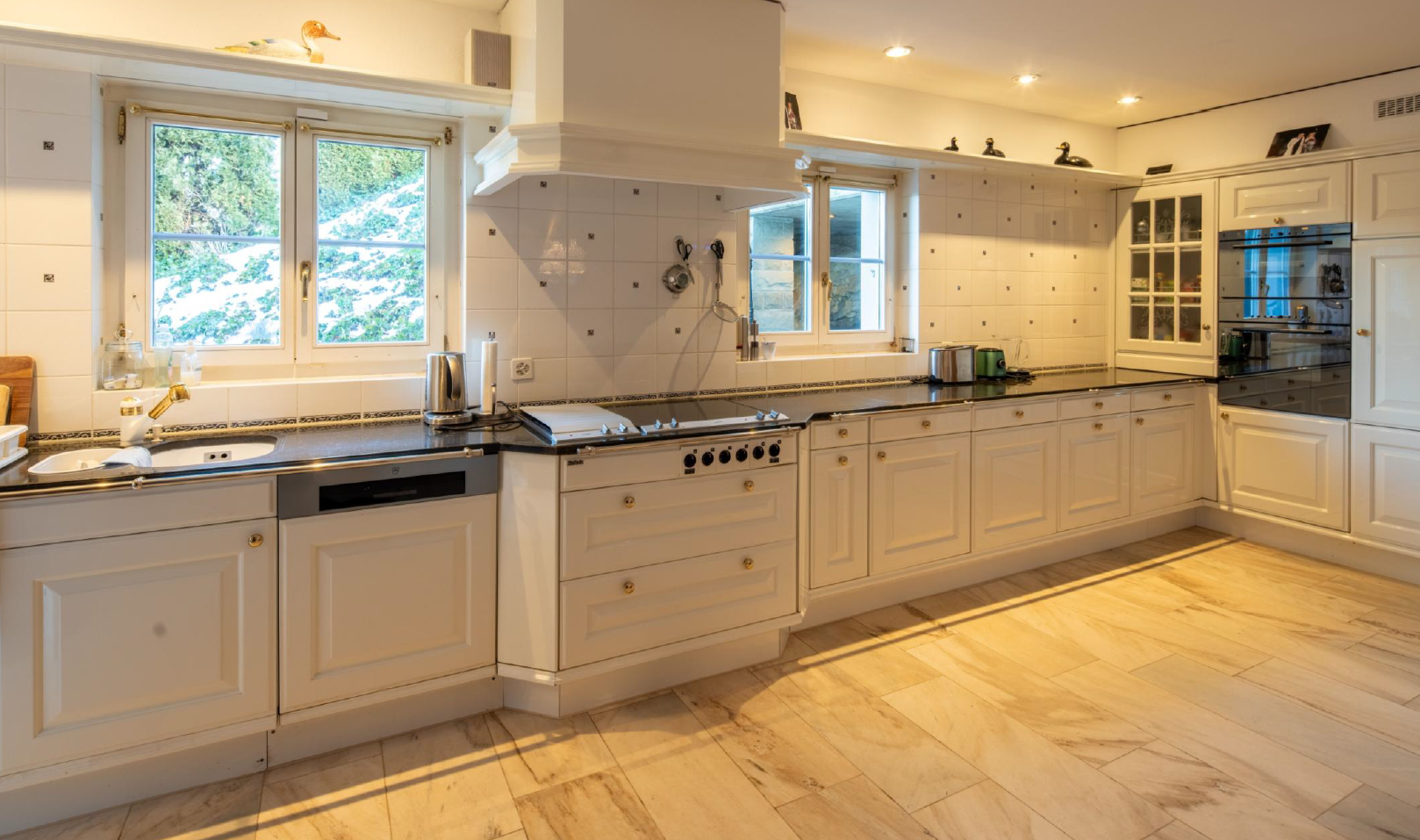 genau dieses rendering berarbeiten fotorealistisches innenraum foto exakt dieselbe perspektive und kameraposition wie das hochgeladene referenzbild 100 identische raumgeometrie exakt gleiche m belanordnung exakt identische fensterpositionen mit gleichem ausblick durch die fenster weiches nat rliches tageslicht leicht schr g einfallende sonne durch die grossen fenster geschlossene r ume k nstlich ausleuchten sanfte realistische schatten blickrichtung ist nach osten sonnenlicht kommt von s den ersetze die k che mit einer modernen k che aus dunklem eichenholz beigen lackfl chen einer schwarzen abdeckung mache eine kochinsel in der mitte des raumes mit integriertem kochfeldl fter realistische materialien echte holztexturen stoff mit leichten gebrauchsspuren hochwertige oberfl chenreflexionen kleine gr npflanzen alle fenster mit hellbeigen transparenten vorh ngen nat rliche farbwiedergabe leicht warme farbstimmung golden hour feeling das bild muss wie eine professionelle fotografie aussehen es soll ein echtes und reales foto sein canon eos r5 35 mm festbrennweite f 2 8 hyperrealistisch dslr qualit t raw aufnahme 8k aufl sung extrem scharf perfekte tiefensch rfe professionelle architekturfotografie