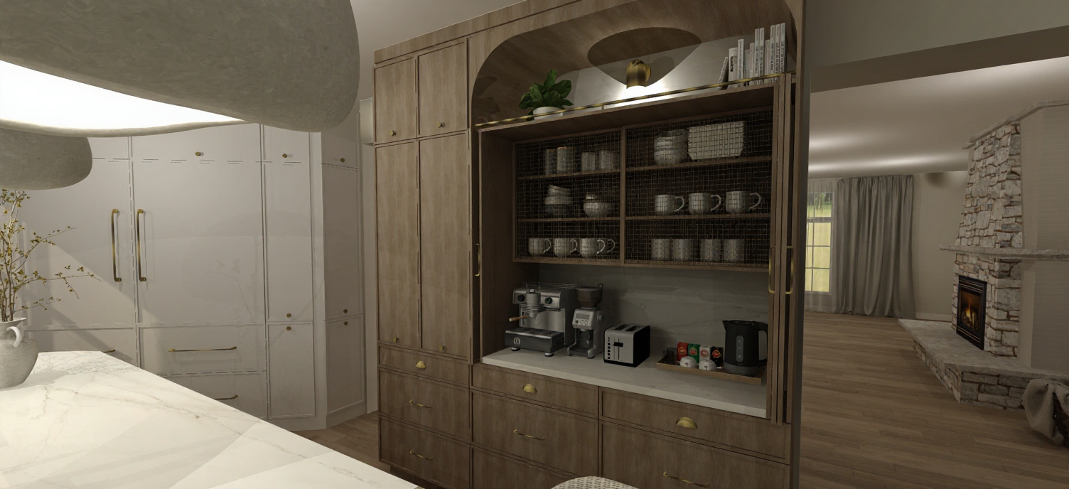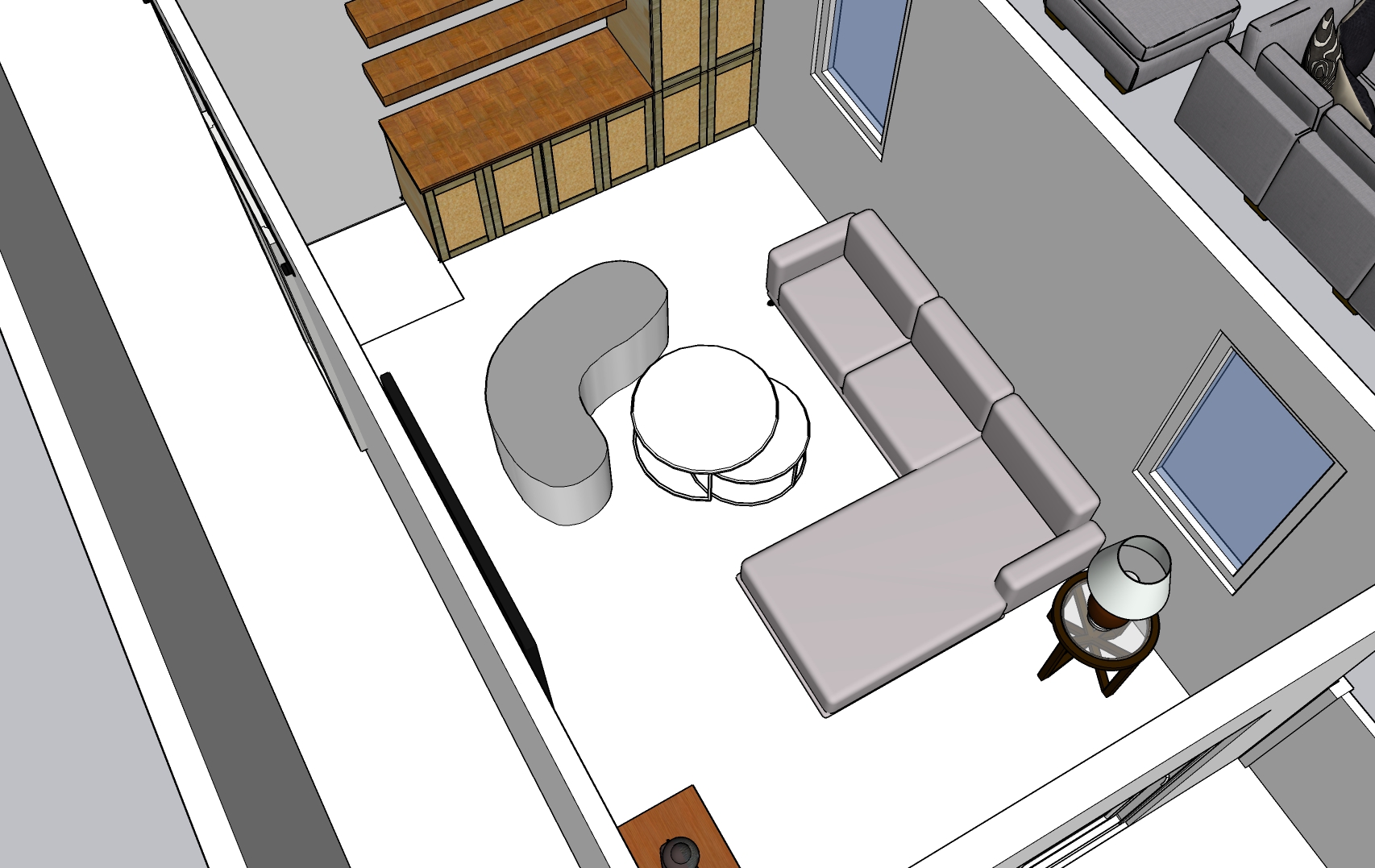 add accessories on bar and shelving artwork to wall over sofa and photo realistic texture on kidney shaped ottoman