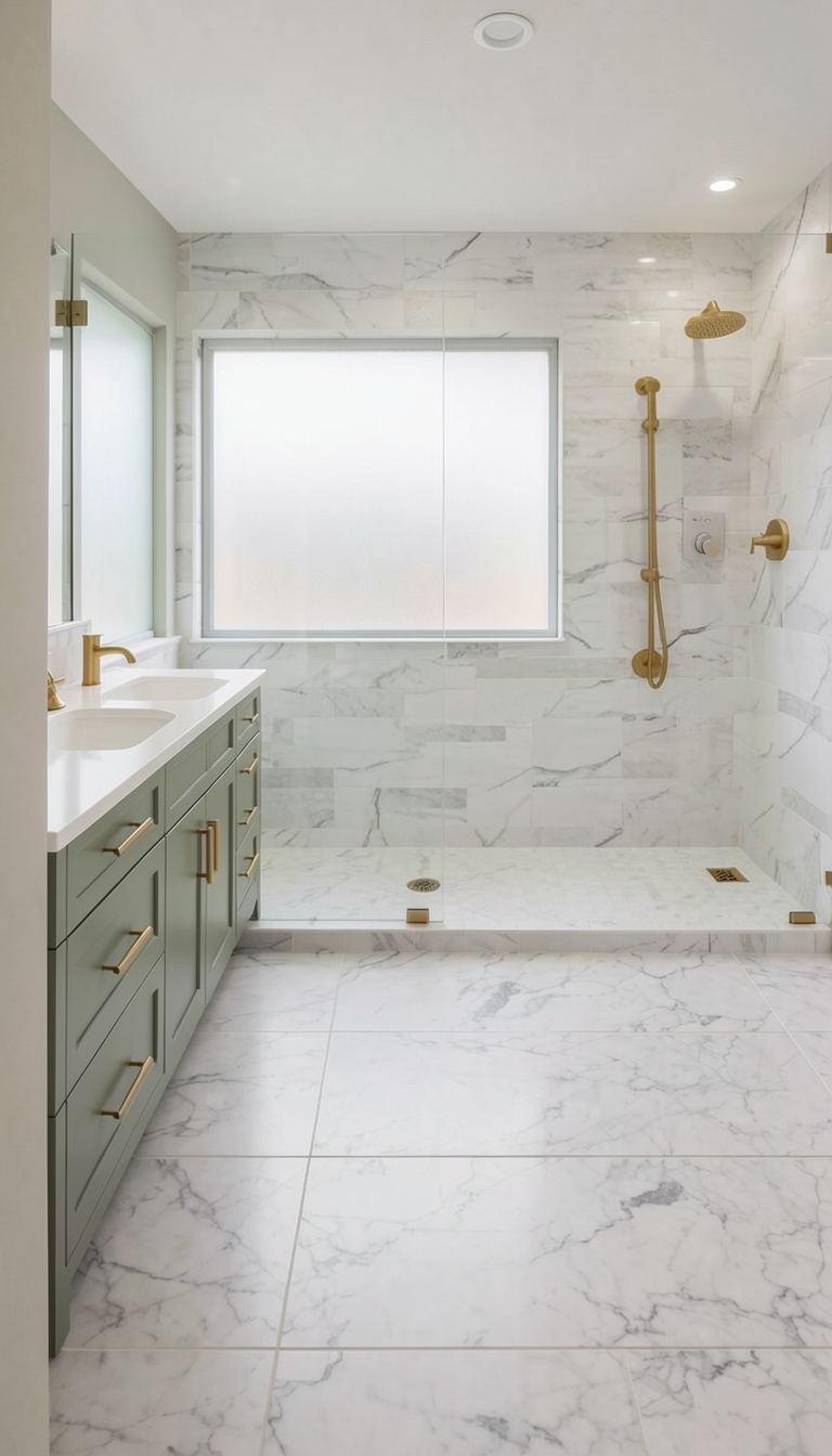 make the sinks further apart remove the door hinges from the shower glass on the left and just make that one solid piece of shower glass leaving an opening on the left closest to the vanity put the showerhead and wand bar on the same wall as the valve trim keep the square gold drain but remove the round drain stop the curb half way into the room from the right side