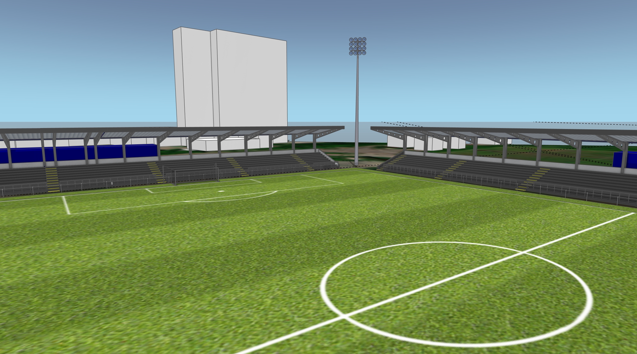 modernist night shot a vibrant modern soccer stadium under a clear blue sky the field glows with lush green grass marked by bright white lines the stands have sleek dark gray seats with accents of soft yellow on the steps tall floodlights stand proudly casting subtle shadows in the background a minimalist white building adds a touch of sophistication the atmosphere is lively and welcoming capturing the excitement of a game day architecture
