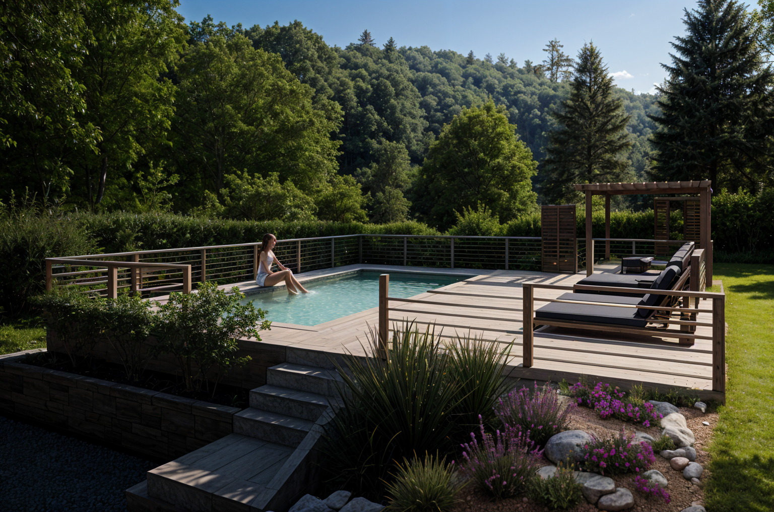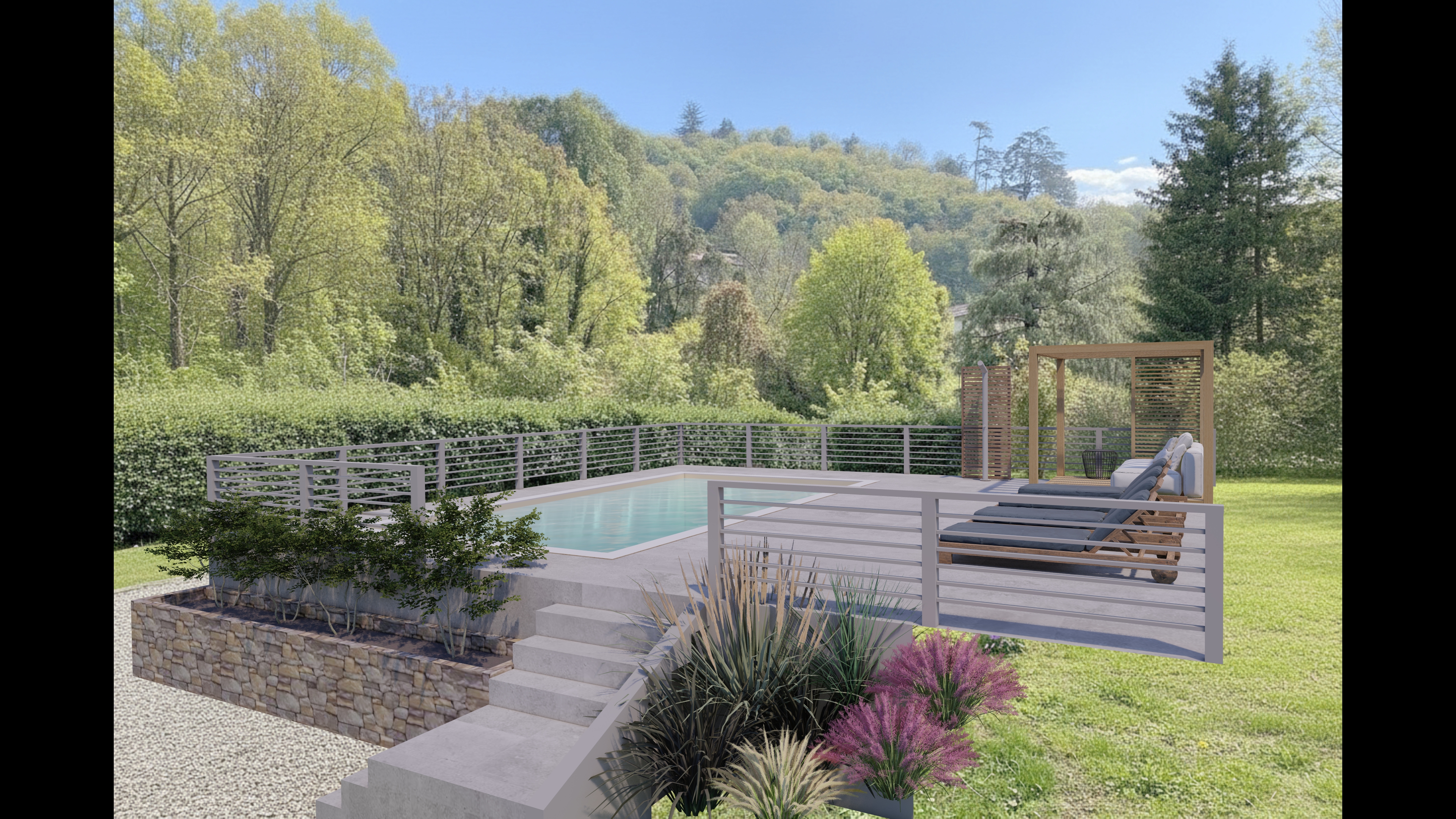a pool with a solarium made by stone tiles some sun loungers a pergola with white sofa and a sun shower on it a rock garden in the foreground