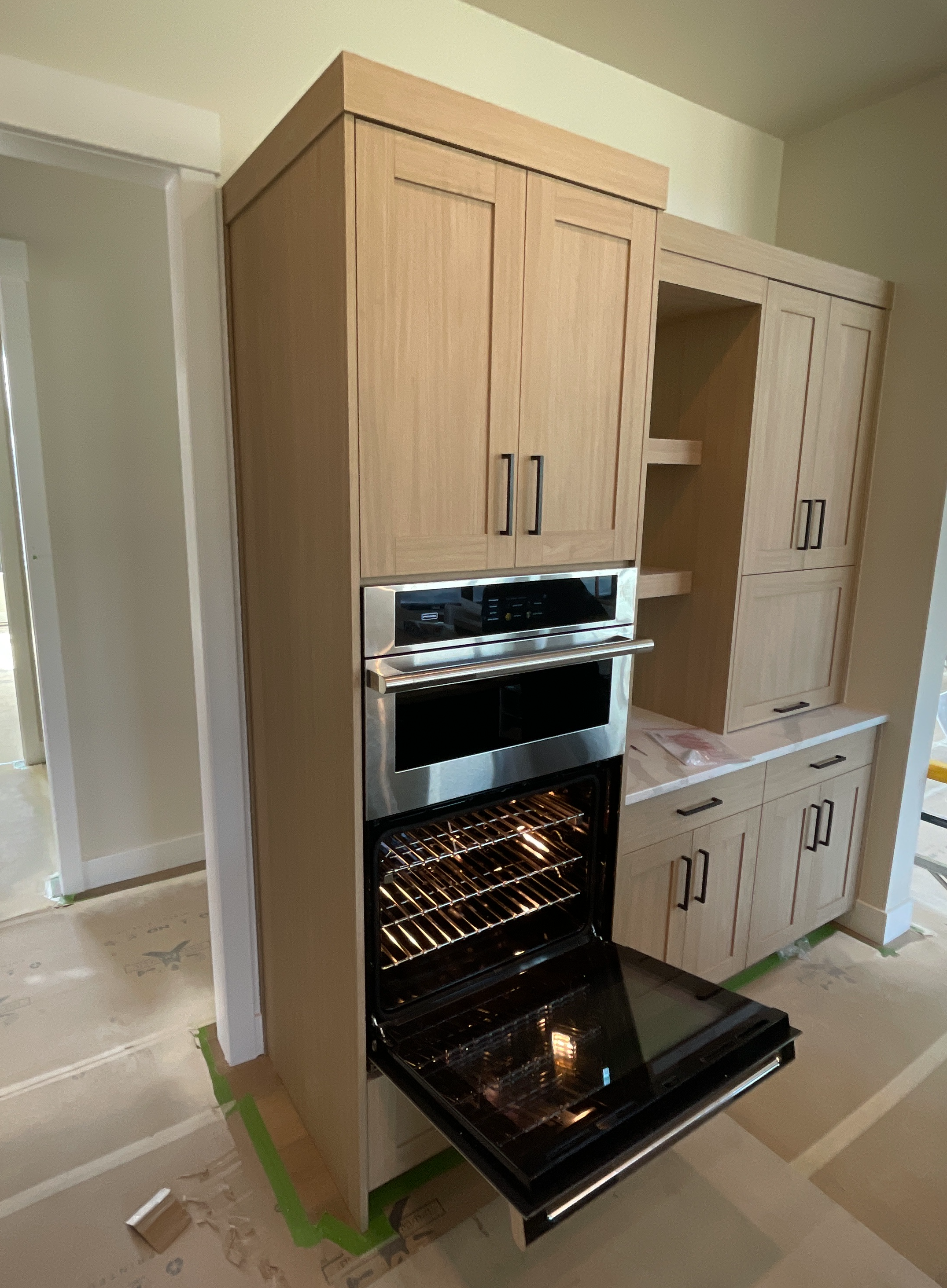 increase natural daylight make the floors wood add food inside of the oven and stage the counter and floating shelves