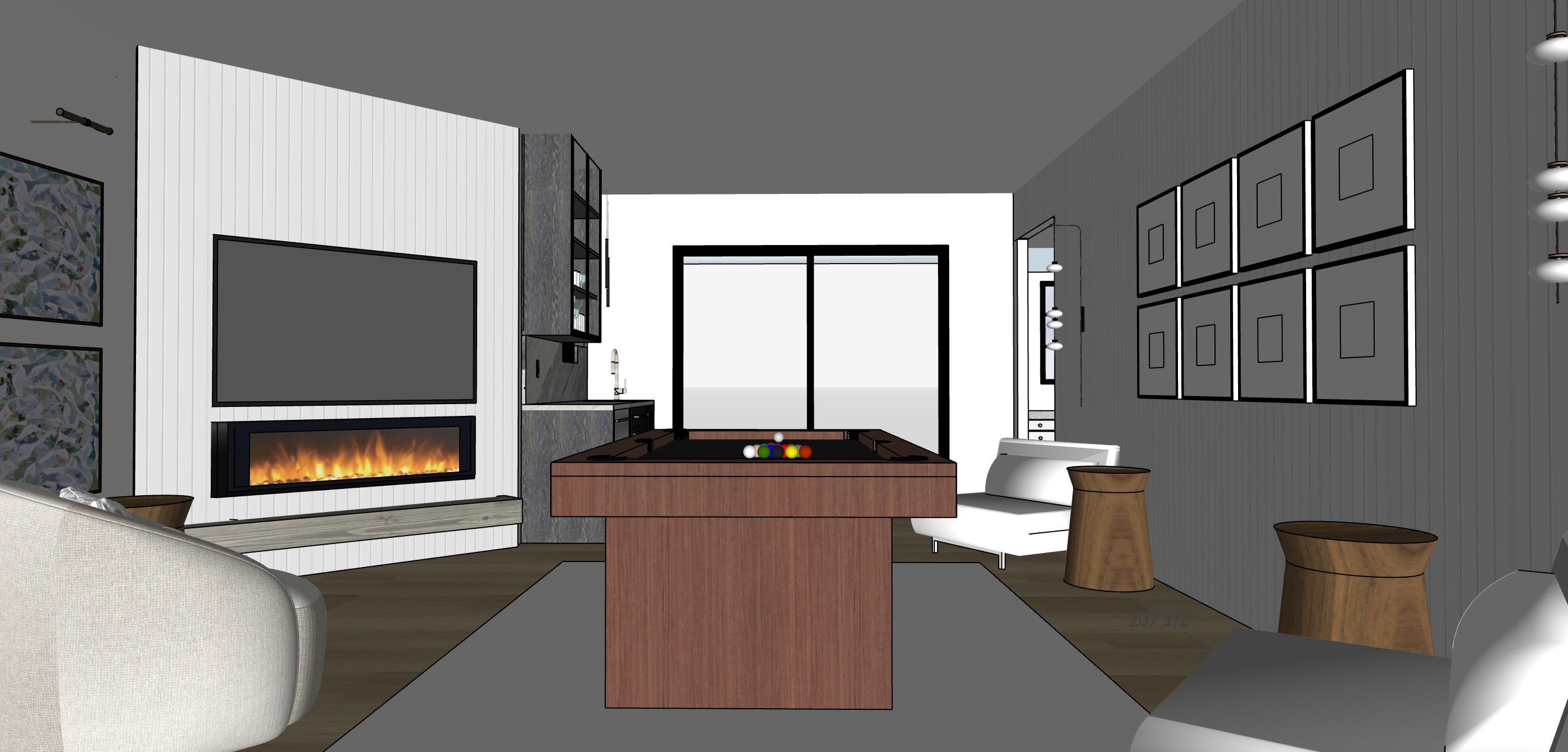 create a photorealistic rendering of this downstairs living area add landscaping and pool in backyard through the sliders add reflection in tv above fireplace add 4 recessed ceiling lights change windows on left above chairs to framed oil pained art with art light above keep art on left as is wall on right of pool table is white shiplap