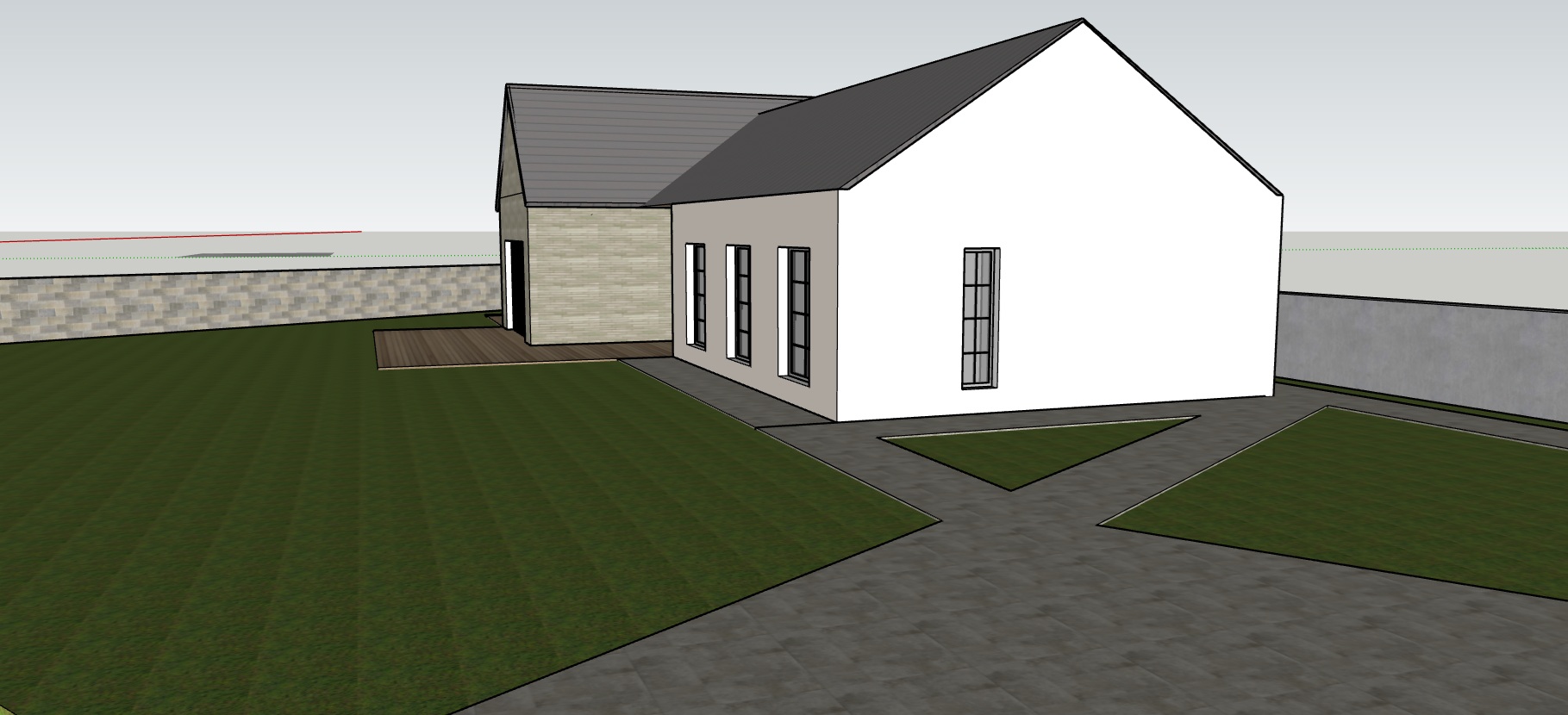 main subject and architecture photorealistic architectural visualization of a luxury single story l shaped country house the house combines traditional and modern styles the left wing features a facade of textured light natural stone limestone or sandstone with a rough surface the right wing has smooth stucco in a cream white shade the roof is gabled covered with dark grey standing seam metal with clean lines and a minimalist gutter system windows and doors large french windows and glass doors with thin black metal frames in an industrial style the glass is clear with subtle realistic reflections of the surrounding greenery and sky on the stone facade there are wall mounted exterior lamps in copper or bronze color adding a rustic touch vegetation and garden landscaping foreground rich planting of flowering plants large clusters of white and light blue hydrangeas and dense clumps of ornamental grasses miscanthus or fountain grass with fine plumes dominate purple flowers of lavender or sage are also visible trees in the center of the composition near the house stands a large mature deciduous tree likely oak or maple with a spreading crown that casts a dappled shadow on the facade and roof of the house along the right wall of the house three slender columnar cypress trees are planted adding a vertical element lawn perfectly maintained deep green english lawn mowed low with a soft texture pots large terracotta clay pots with herbs and smaller shrubs are placed on the stone terrace environment and surfaces a spacious terrace paved with large format stone pavers in grey shades slate or granite with a matte finish spreads out in front of the house in the background a masonry wall and other trees can be seen suggesting privacy and an enclosed garden lighting and atmosphere light the scene is bathed in golden hour light late afternoon or early evening the sun comes from the left side at a low angle reflections and shadows the light creates long soft tree shadows that stretch across the lawn and draw branch patterns on the light facade of the house the atmosphere is peaceful idyllic warm and inviting the sky is clear with a subtle hint of blue