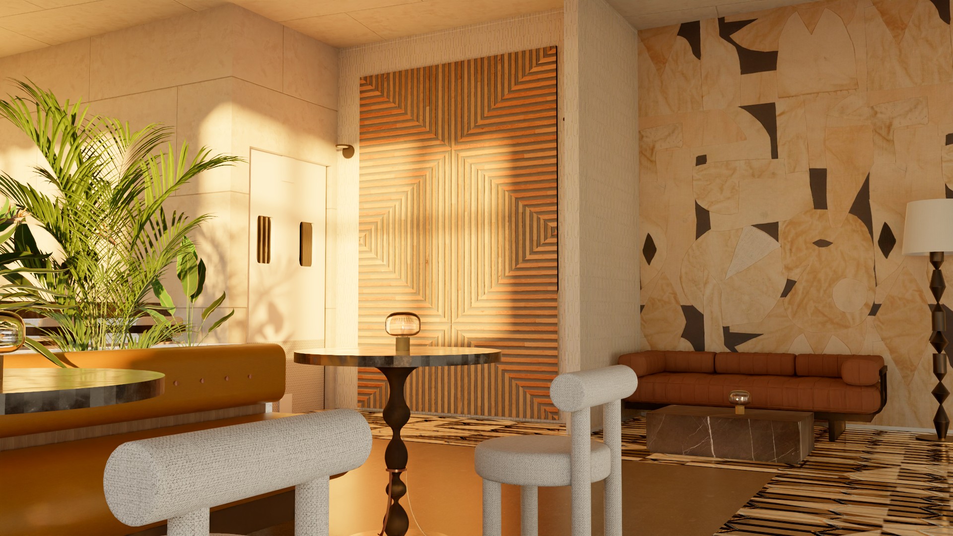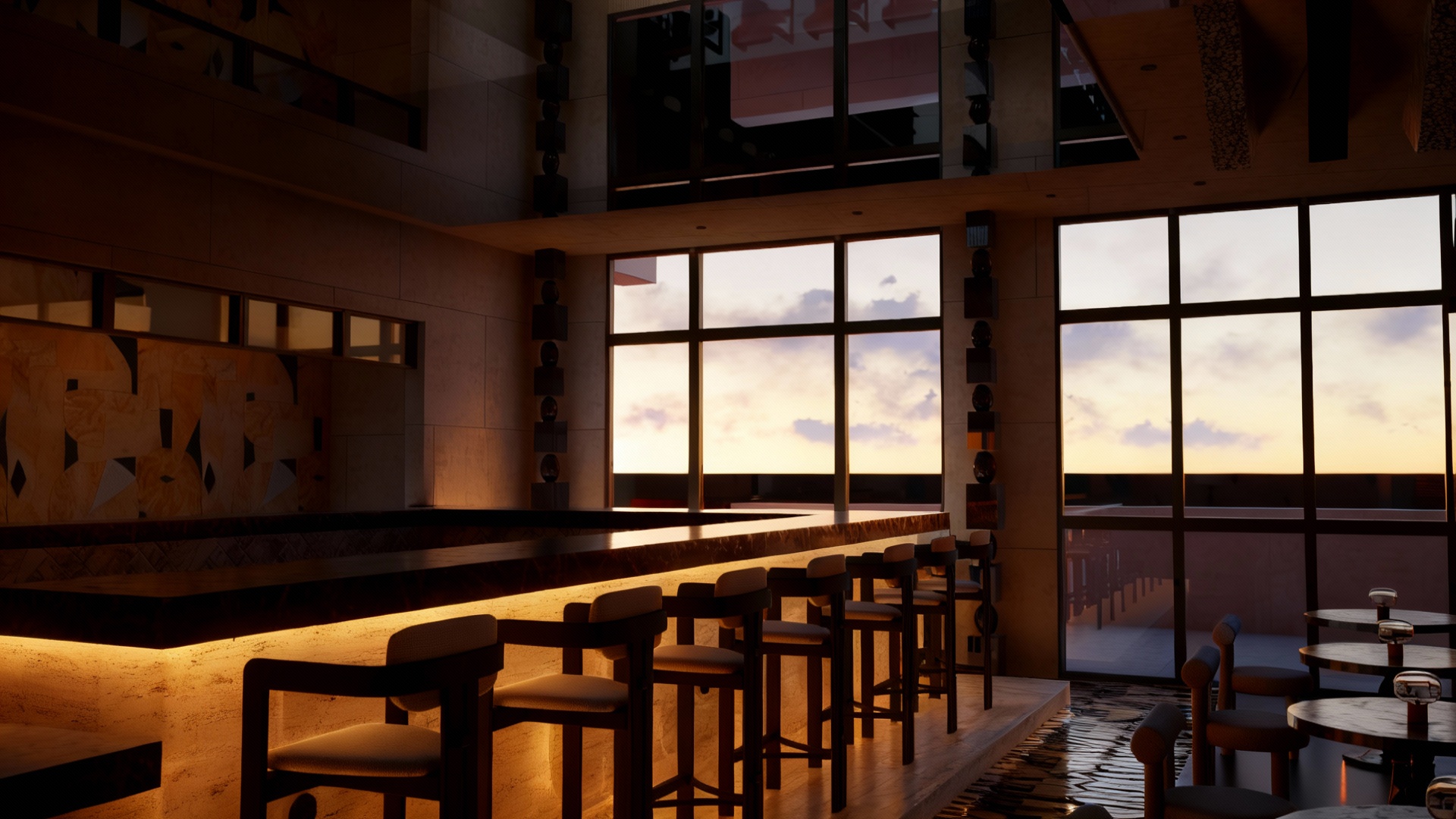 create a luxurious modern interior space with an open and airy design the room is filled with natural light streaming through large floor to ceiling windows casting soft shadows on polished marble surfaces use a color palette of warm beige and cream for the walls and ceiling contrasting with dark rich brown and black accents on the geometric ceiling features incorporate sleek metal and glass elements with a subtle reflective quality on the bar counter add vibrant green indoor plants along the edges for a touch of nature and include comfortable seating with muted mustard cushions maintain a sophisticated and tranquil atmosphere balancing contemporary elegance with inviting warmth