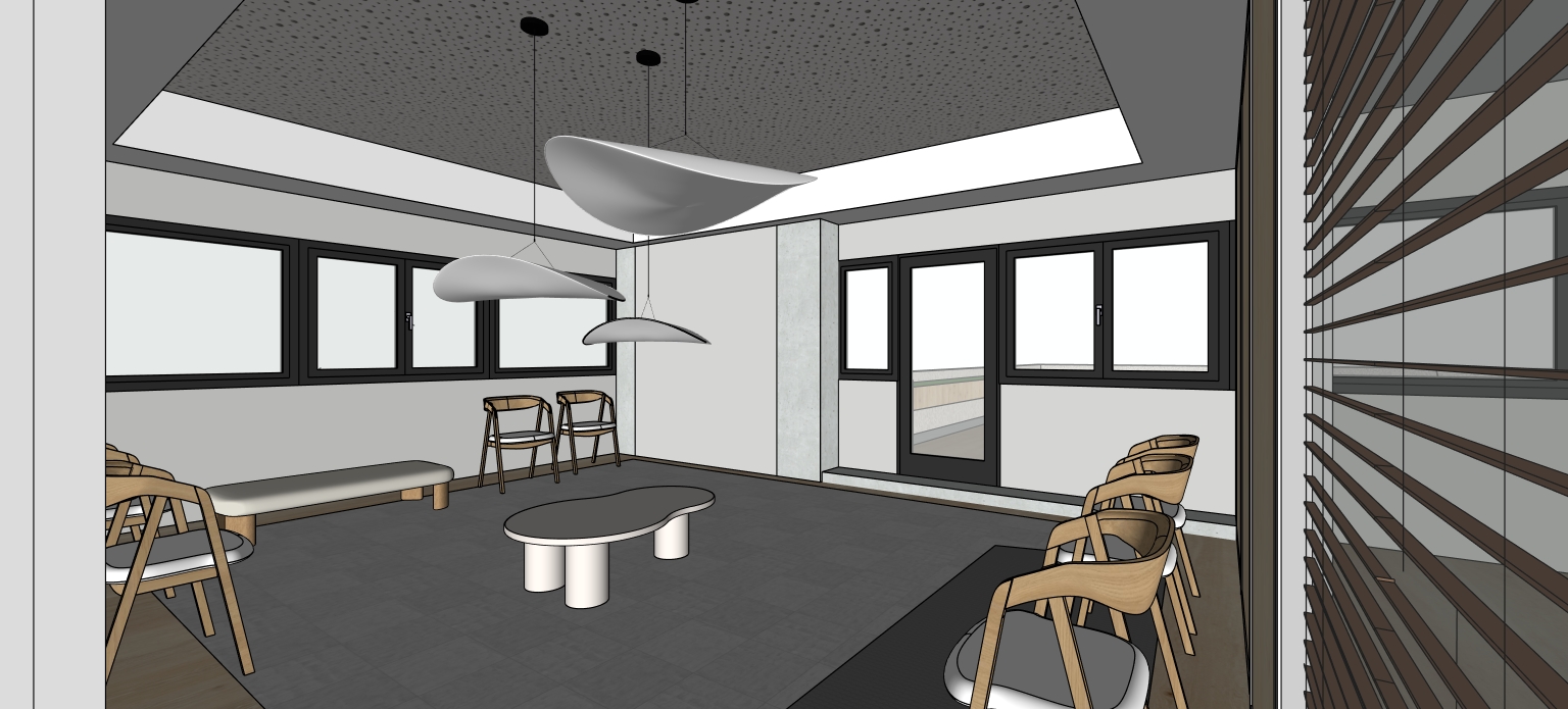 la suspension lumineuse est clair e on peut ajouter des quelques spots dans le couloir par les fen tres on a une vue sur de la v g tation et des petite immeubles les suspensions lumineuses sont clair es les montants des cloisons mobiles sont blanc respecter les cloisons vitr es avec stores et les cloisons pleines gris clair mat les assises des chaises sont blanches il n y a pas de stores aux fen tres ext rieures pas de spot sur le faux plafond bois la table basse centrale est blanche les murs sont gris la pi ce droite est un bureau de la m me profondeur que la salle d attente la porte est vitr e
