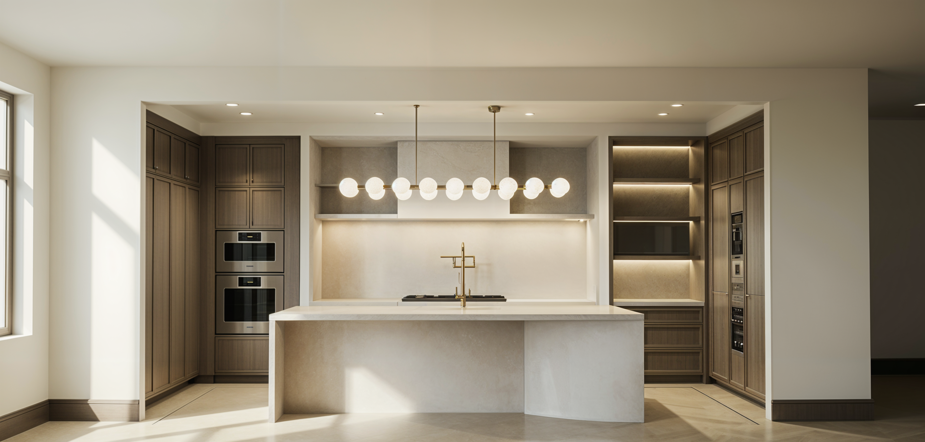 brighten up the floating shelves on the right they should not have such harsh shadows also make the window on the left full height fkloor to ceiling do not change anything else