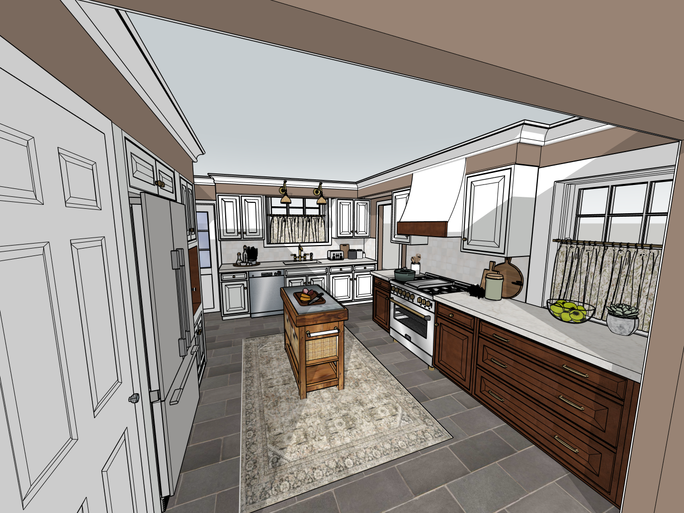 create a photo realistic rendering of my 3 d sketchup image include add a ceiling with recessed lighting