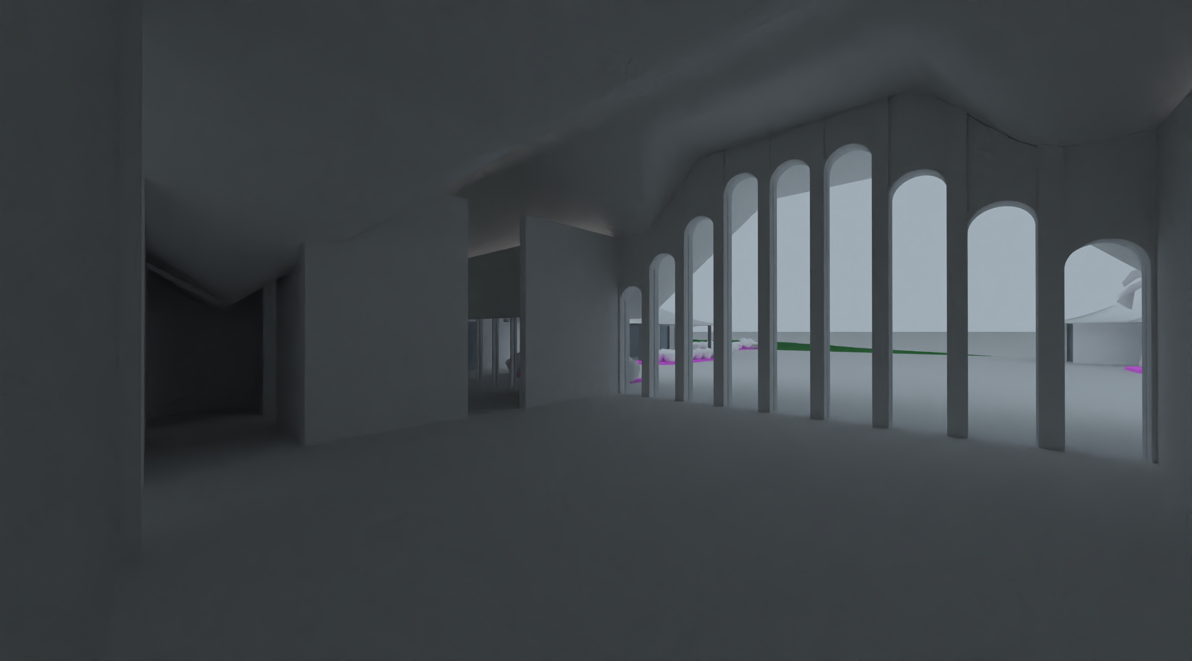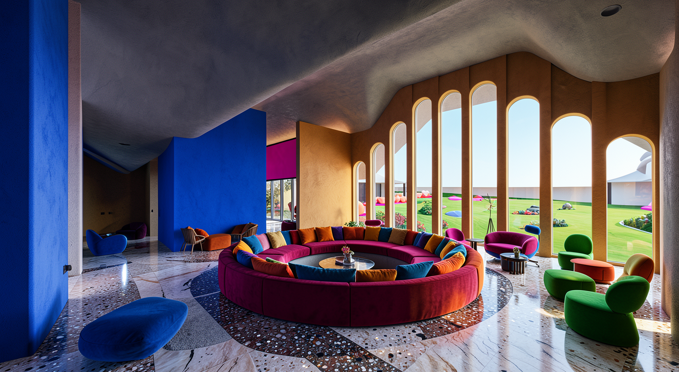 large double height immersive entertainment room sunken rotating circular conversation pit in the center oversized projection wall for movies dramatic sculptural ceiling organic marble terrazzo flooring futuristic lounge atmosphere neon accents and gradient color lighting bold experimental furniture shapes reflective and matte material contrast playful and cinematic environment high end experiential design wide angle architectural visualization