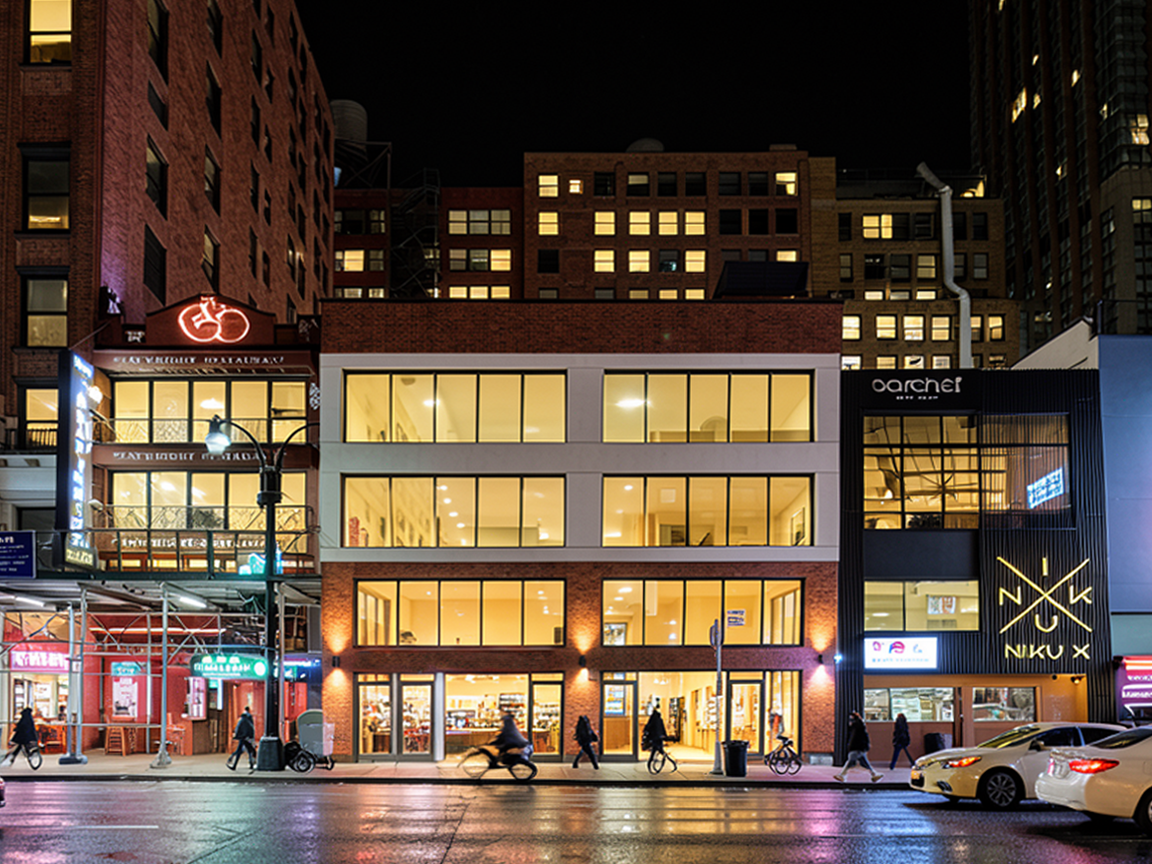 transform the interior visible through the windows into a vibrant fully designed restaurant scene use a natural mix of small tables 2 4 seats staggered layout and varied spacing avoid long communal tables or repetitive alignment populate with realistically scaled people in small groups interacting organically talking eating turning reaching maintain accurate human scale relative to furniture chairs tables bar height add waitstaff moving through the space warm layered lighting depth and subtle motion blur ensure correct perspective from exterior view and realistic reflections on glass no symmetry no repetition no oversized figures consistent vanishing point and perspective realistic glass reflections and interior depth no cutout or collage effect