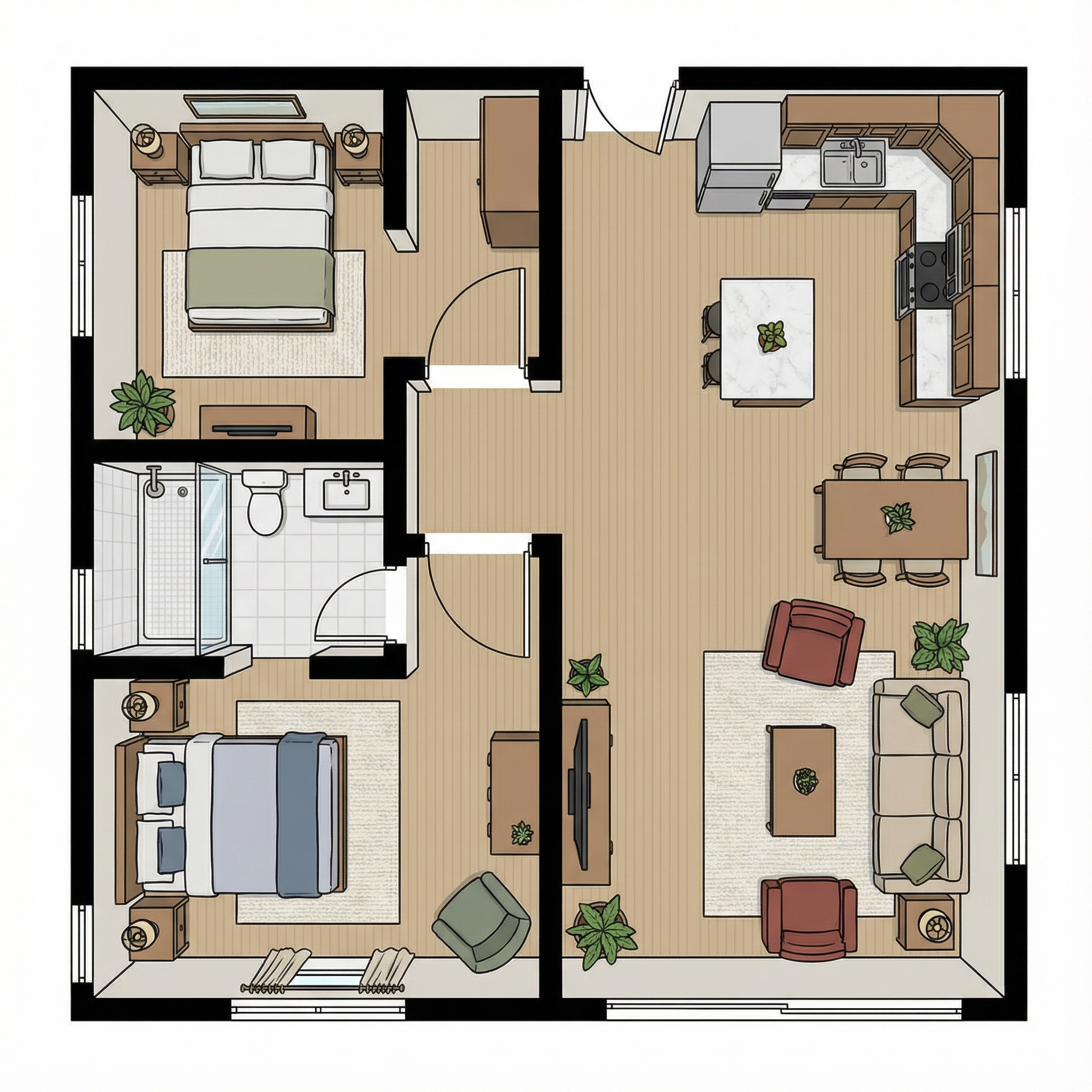 convert this floor plan into a realistic isometric 3d view of a full house show the space from an elevated angle with furniture walls and details visible use the same furniture as shows on the plan do not change the orientation of the floorplan