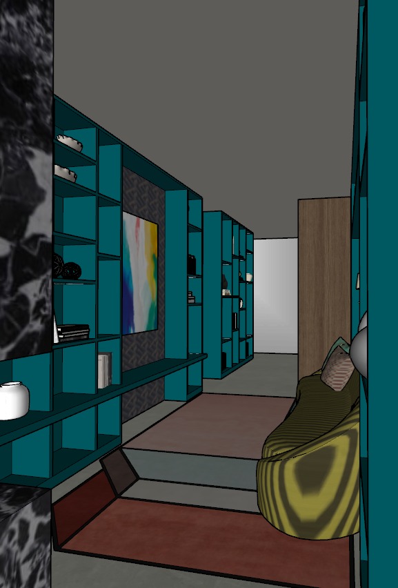 there is no window or natural light in this room add lights to shelving add wall to wall mirror in the back wall