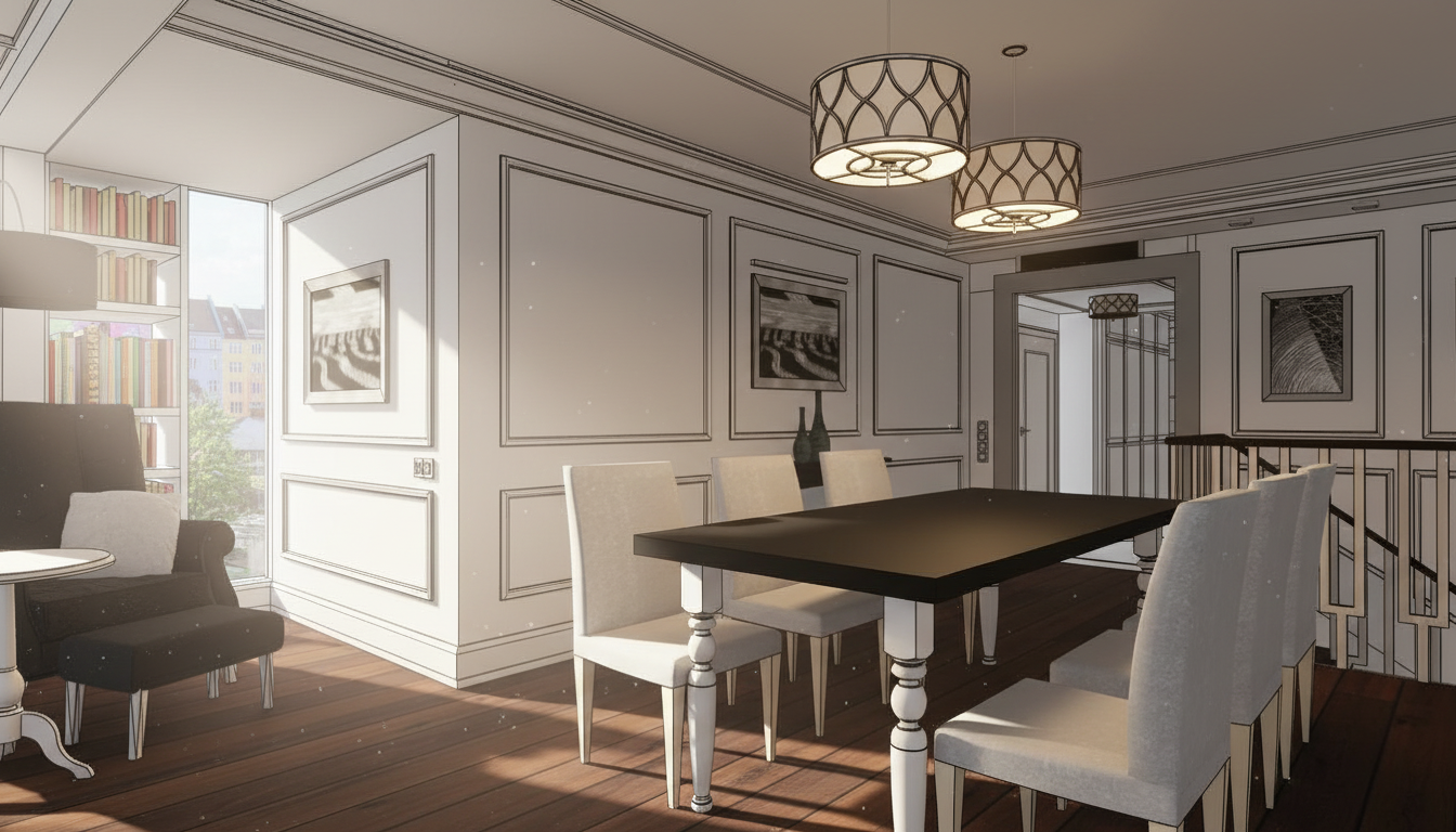 international style interior shot create a nice realistic interior visualization do not change materials maintain correct scale and proportions use physically accurate lighting with soft global illumination and high quality textures ensure precise details with realistic reflections and shadows the lamps are turned on and emit warm light with visible light sources keep natural exposure a nice view is visible through the window in the corridor there is no window behind the stairs there is a bookshelf with books behind the armchair do not add stylization or artistic effects the result must be photorealistic architecture