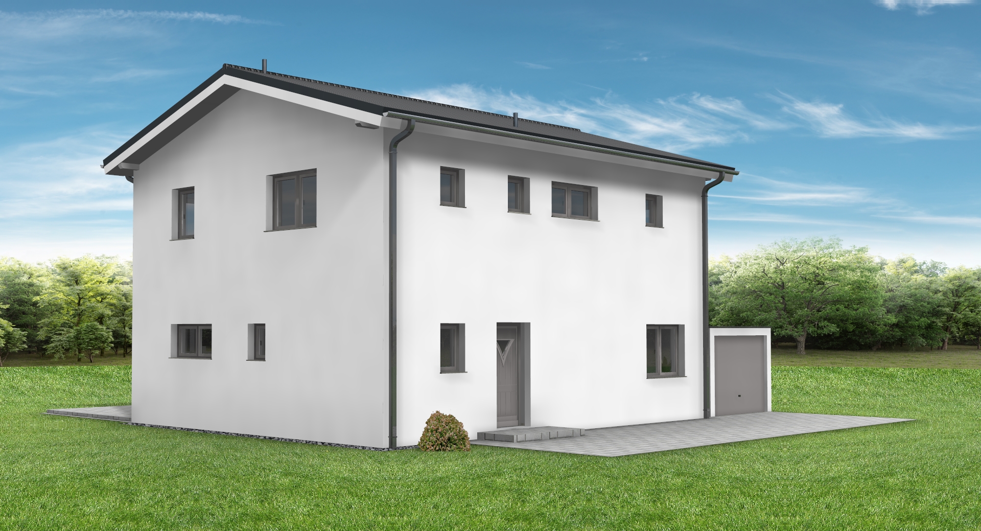 erstelle f r exakt dieses haus eine realistische au enansicht dach anthrazit fassade wei fenster und haust re hellgrau das haus soll in einem dezent modernen garten situiert sein behalte alle ma e und farben des hauses exakt bei