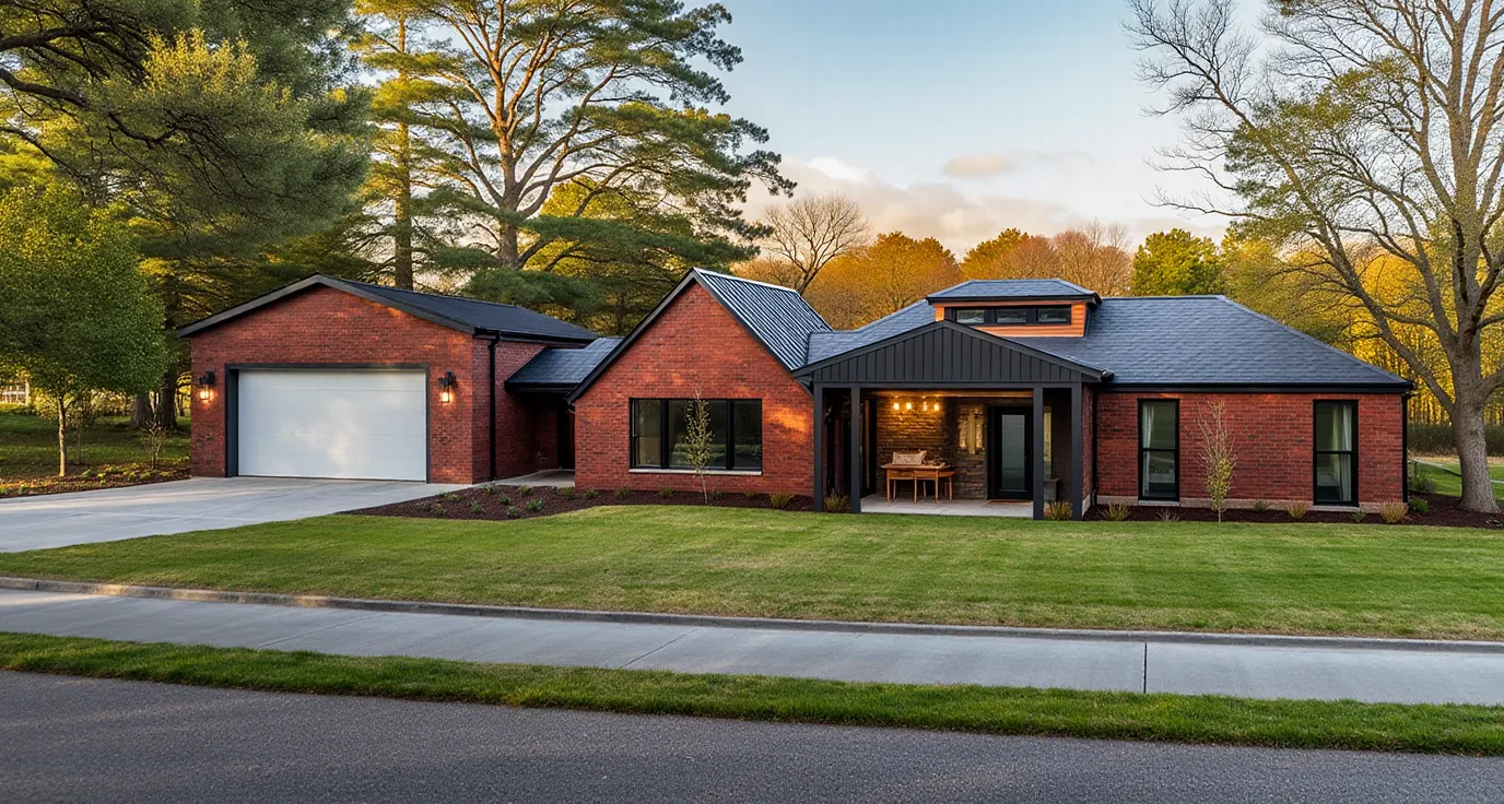 tongue and groove vertical cedar siding black gutters and soffits add can lights in the soffits trex deck with cedar posts and cable rail for deck railing asphalt shingle roofing landscape is a forested pacific northwest coastal rain forest hillside with tall trees in the background no grass