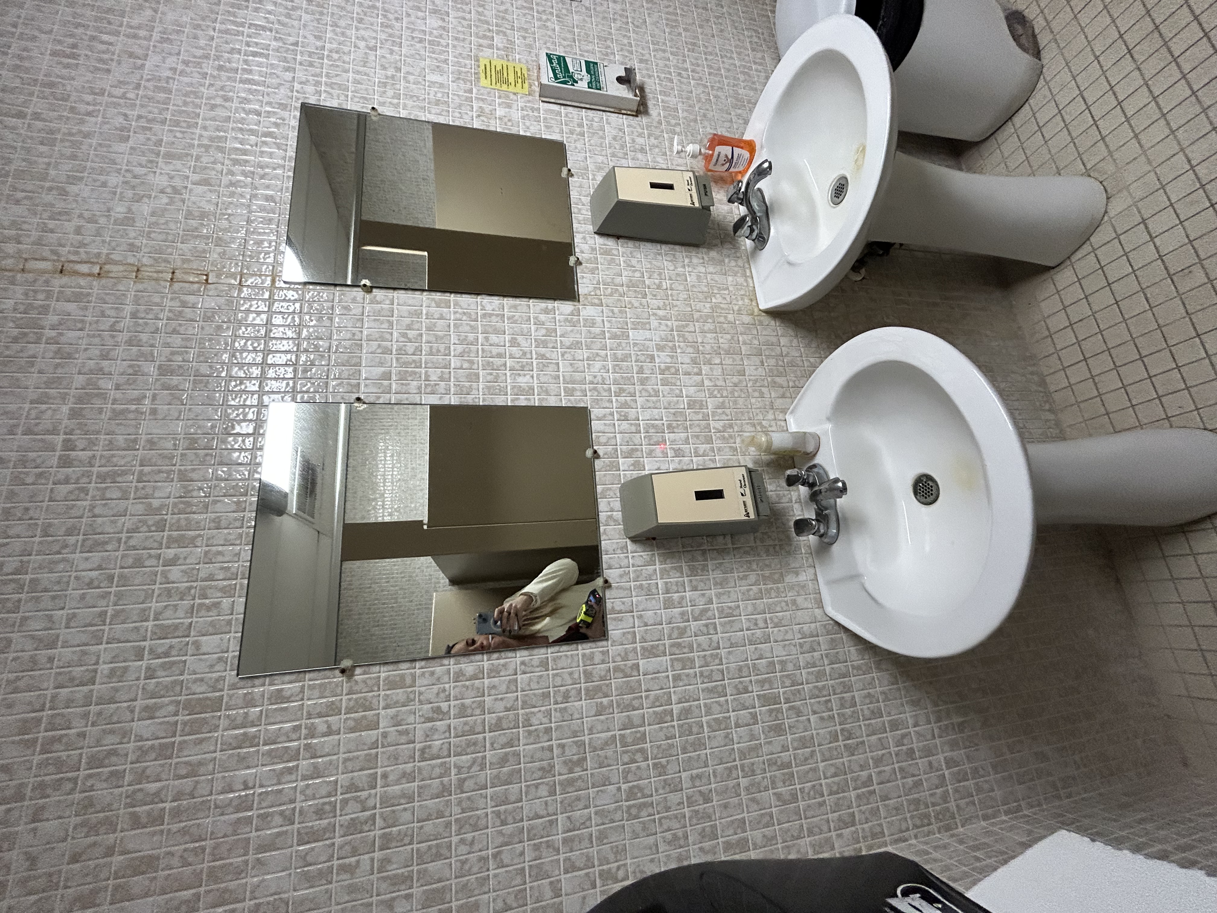 make toilet partitions black change wall tile white subway wainscot with dark charcoal paint top half keep pedestal sinks add new framed mirrors