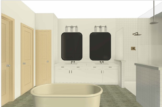 a luxurious and serene bathroom featuring a glass shower enclosure with soft beige tiles and brass fixtures the bathtub is a pristine white complemented by a sleek gray stone floor the double vanity is adorned with marble countertops and warm natural wood cabinets accented by elegant brass hardware the atmosphere is calm and inviting with abundant natural light casting gentle shadows no window
