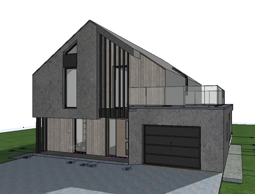 ultra realistic architectural render of a modern barn house modern stodo a simple gable form facade combining dark raw concrete and dark oak wood panels black trapezoidal sheet metal roof large floor to ceiling windows with black aluminum frames minimalist design elegant modern countryside house natural garden and grass around soft sunset lighting cinematic light photorealistic architectural visualization 8k sharp details realistic materials professional architecture photography wide angle