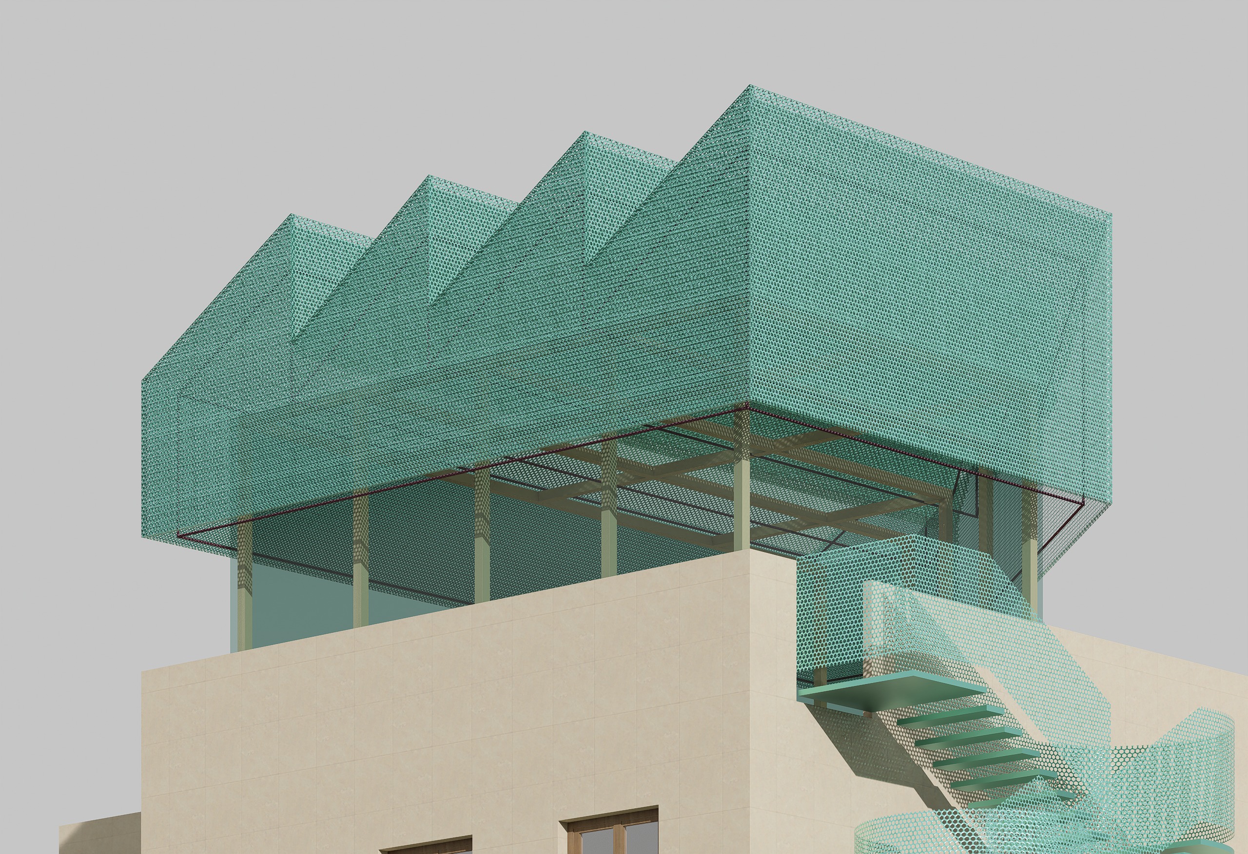 retain the image structure and colour and do not alter any details create it with ultra photorealism with natural sunlight and overall bright render the material are green mesh retain the same colour there is wooden columns birch wood and glass