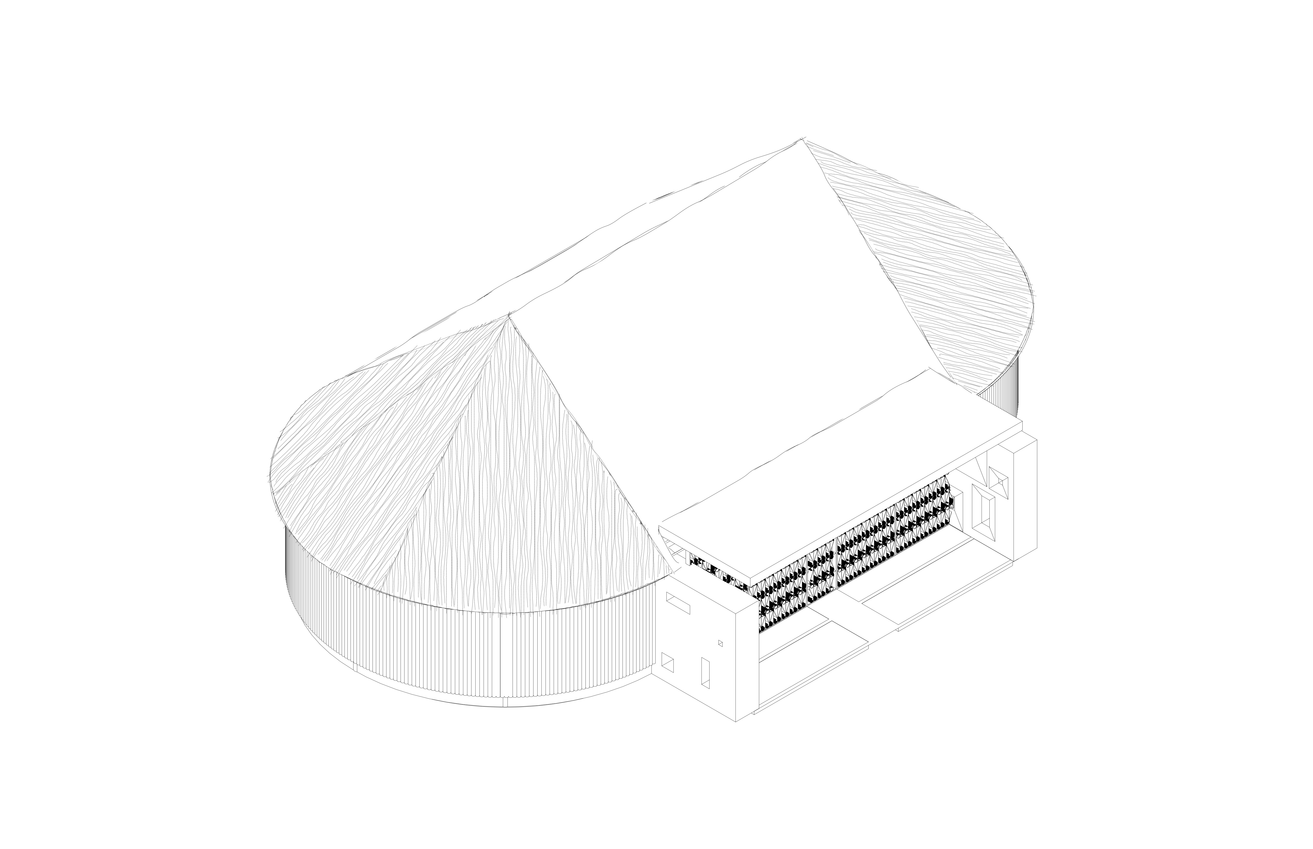 the architectural model is mounted on a base made of the same material and is accompanied by small natural look miniature trees placed on both sides providing scale and context the background is neutral and gray typical of a studio photograph for architectural models the model itself is crafted from materials resembling balsa wood or kraft cardboard