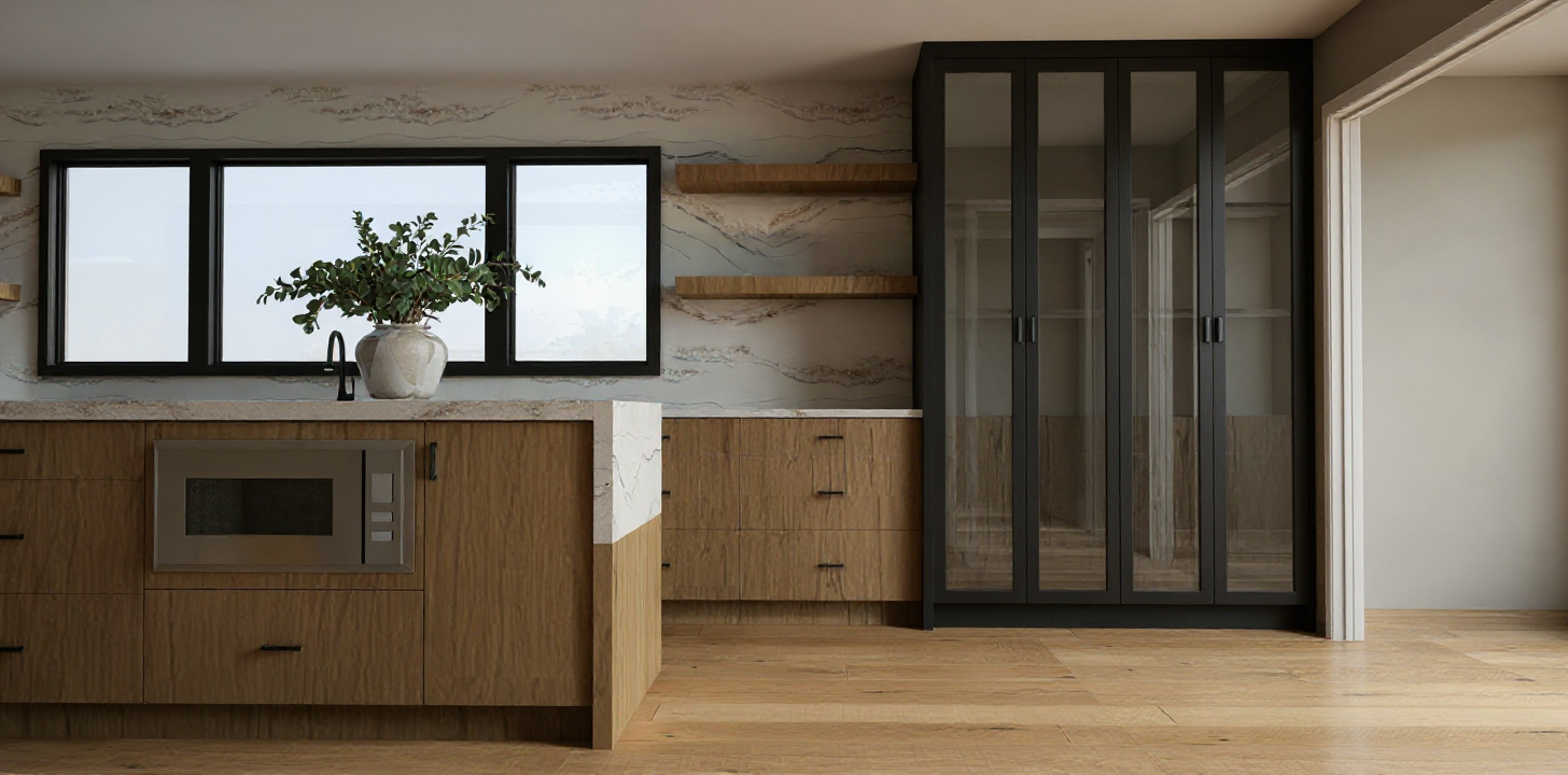 render a house in a tennessee subdivision with blue metal tuff rib siding and black metal tuff rib roof add a concrete sidewalk and porch in the front with nice landscaping the door will be a white 6 panel door with no window