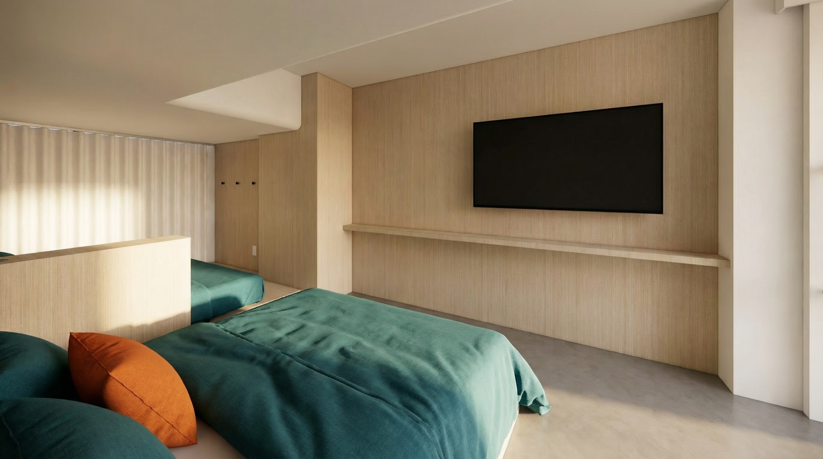 hotel setting add teal linens to bed with orange accent pillow keep wood tone consistent add clothes to wall hooks add hotel items to shelf below tv