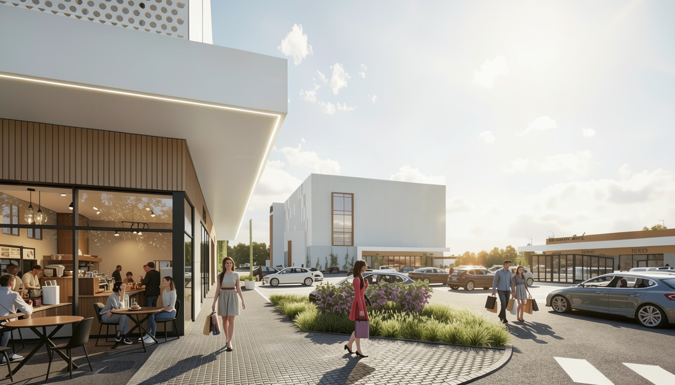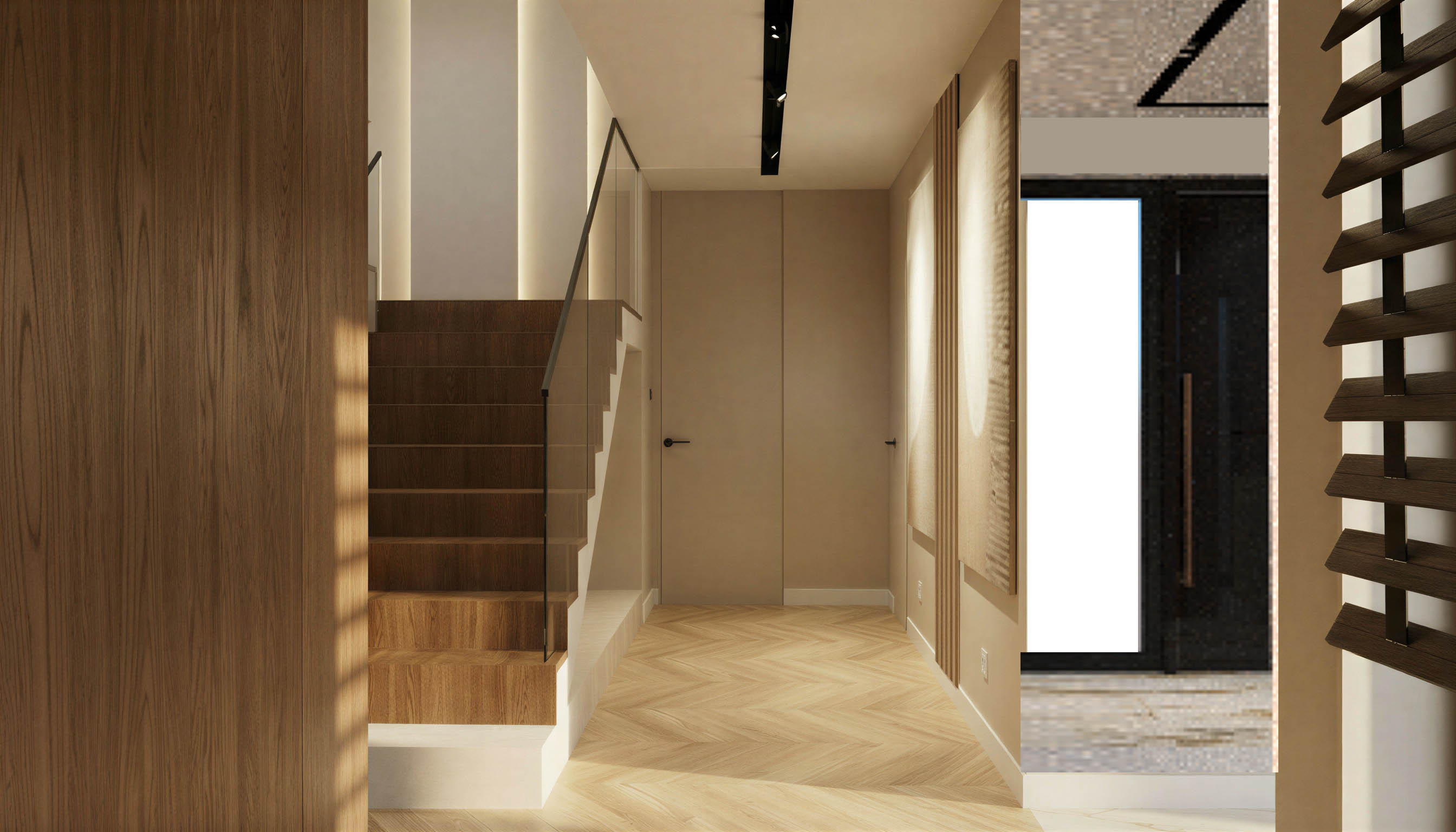 on the right side there is a mirror reflecting the front door with a window and through the window you can see greenery and a path leading to the house