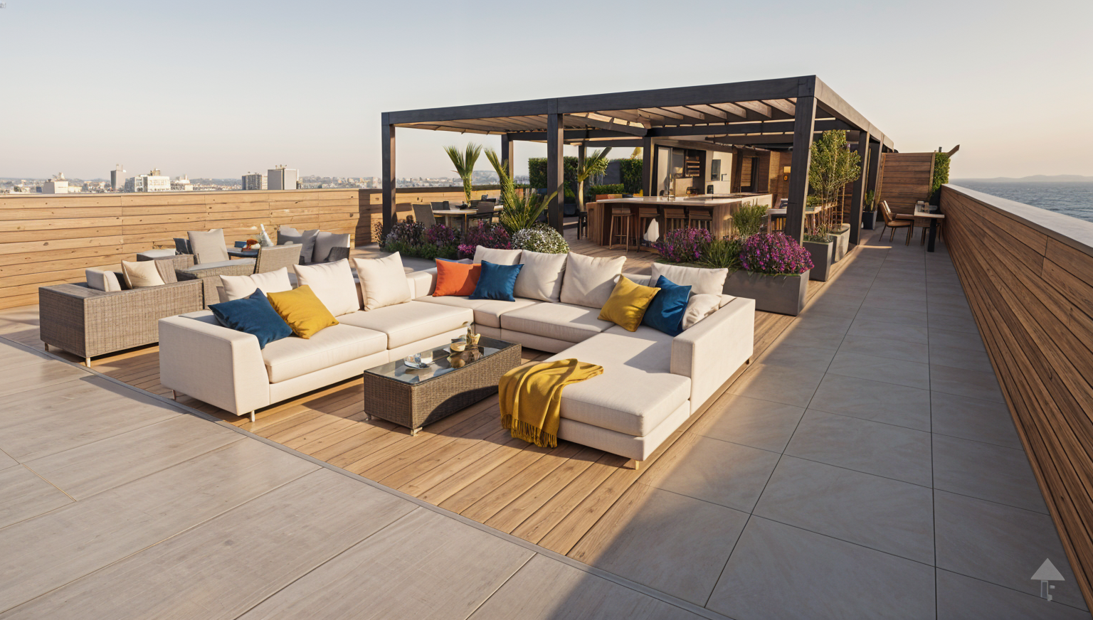 render this kitchen with natural day light add decorations on the shelfs add trees in the windows maintain the exact materials just add the natural light