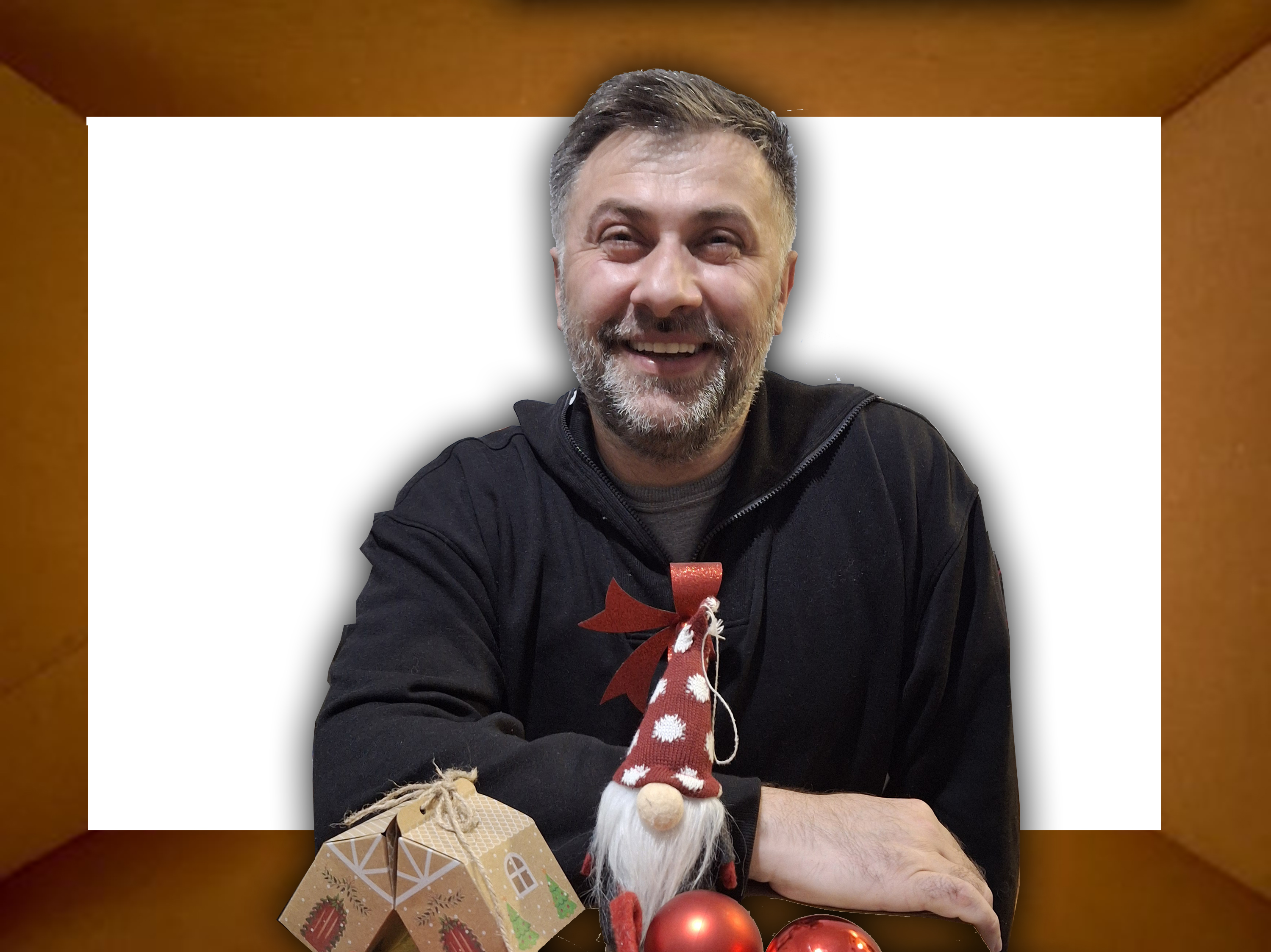 keep the person exactly the same don t retouch it add litlle wrinkles on the forehead but make it like he s posing in the box