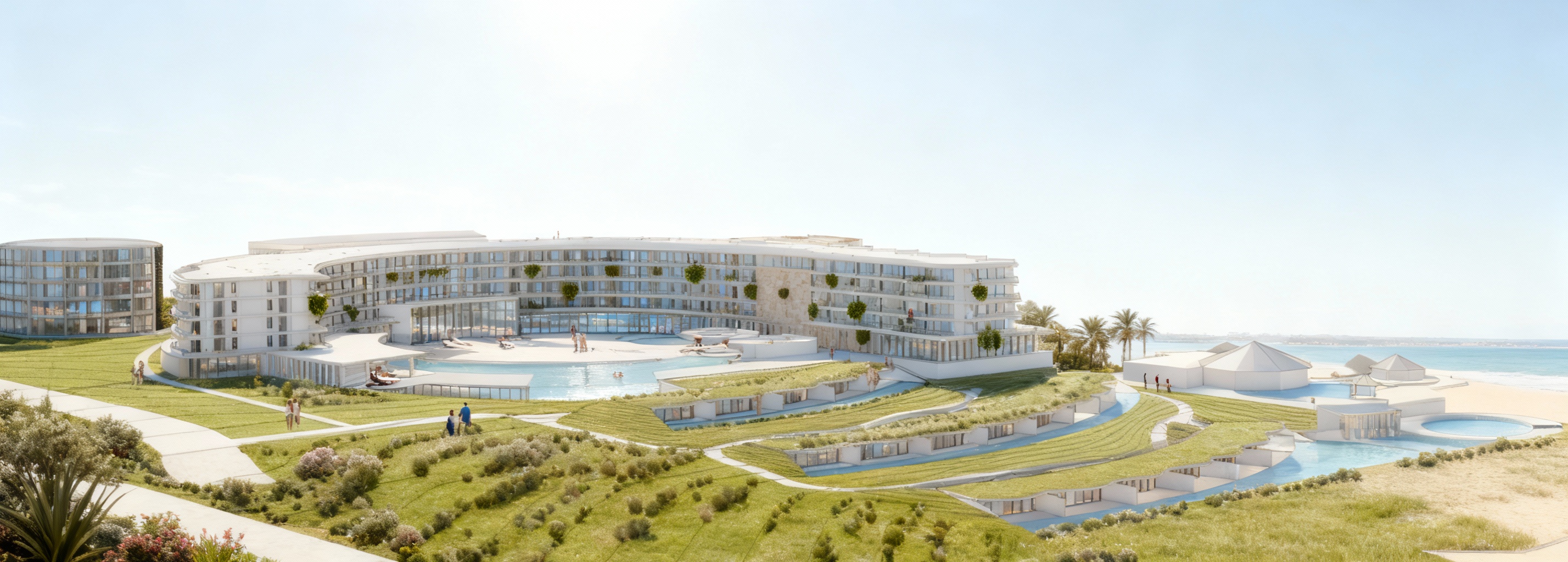 generate a close aerial drone render emphasizing the existing roof forms while keeping all architectural elements unchanged maintain the original 3d angle and building proportions smoothen the terrain but preserve elevation steps surround the complex with lush tropical dry green vegetation abundant green grasses leafy shrubs denser tropical dry climate trees and richer green textures throughout the slope enhance the evergreen garden around the villas with deeper fuller green planting do not modify anything in the 3d model