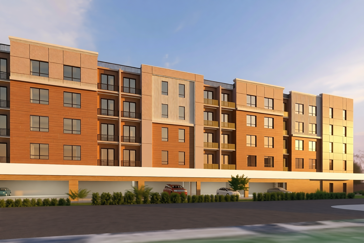 make photo realistic add driveway front walk landscaping with river rock and low mountains in background sun at front of house early afternoon asphalt shingle roof gable fascia trim is dark green except for at front timbers green color is benjamin moore hunter green 2041 10