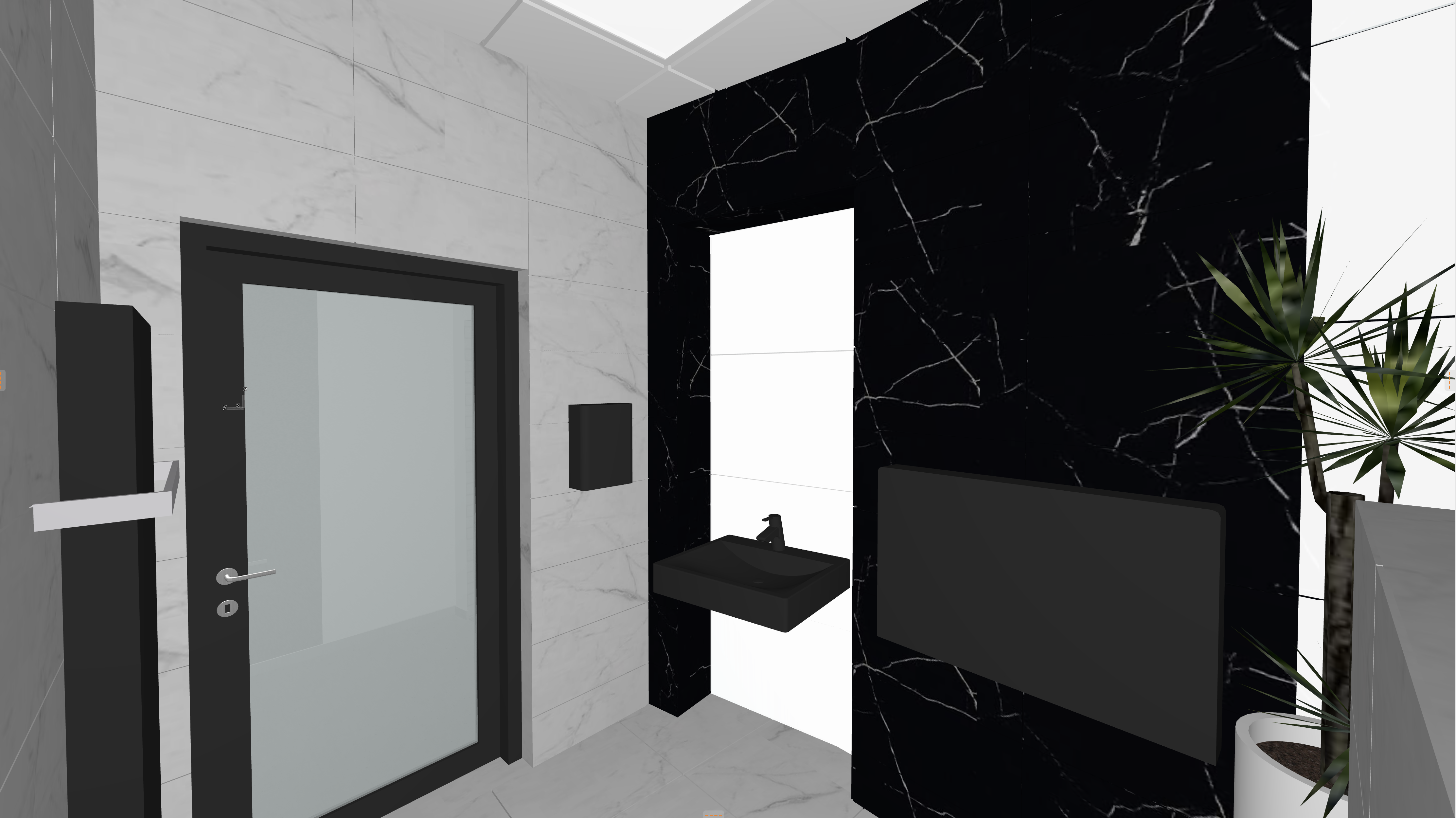 interior from the top white and black stone on the walls make a vertical mirror behind the sink and a flower pot architecture