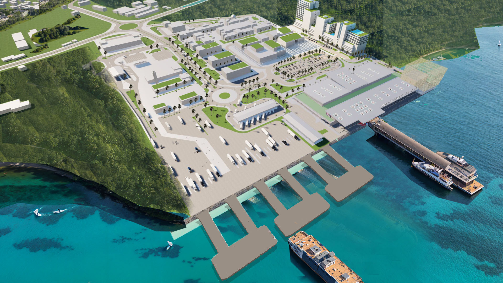 quiero que haya mas vida dentro de la terminal mas circulacion mas camiones llegando a los muelles en los muelles deberian haber personas trabajando subiendo y bajando cosas de los buques el edificio que esta hacia arriba es un hotel deberia verse como un hotel compuesto de un basamento comercial y 4 volumenes e torre con hoteles poner algunos veleros en el mar las cubviertas de los edificios son verdes y tienen paneles solares